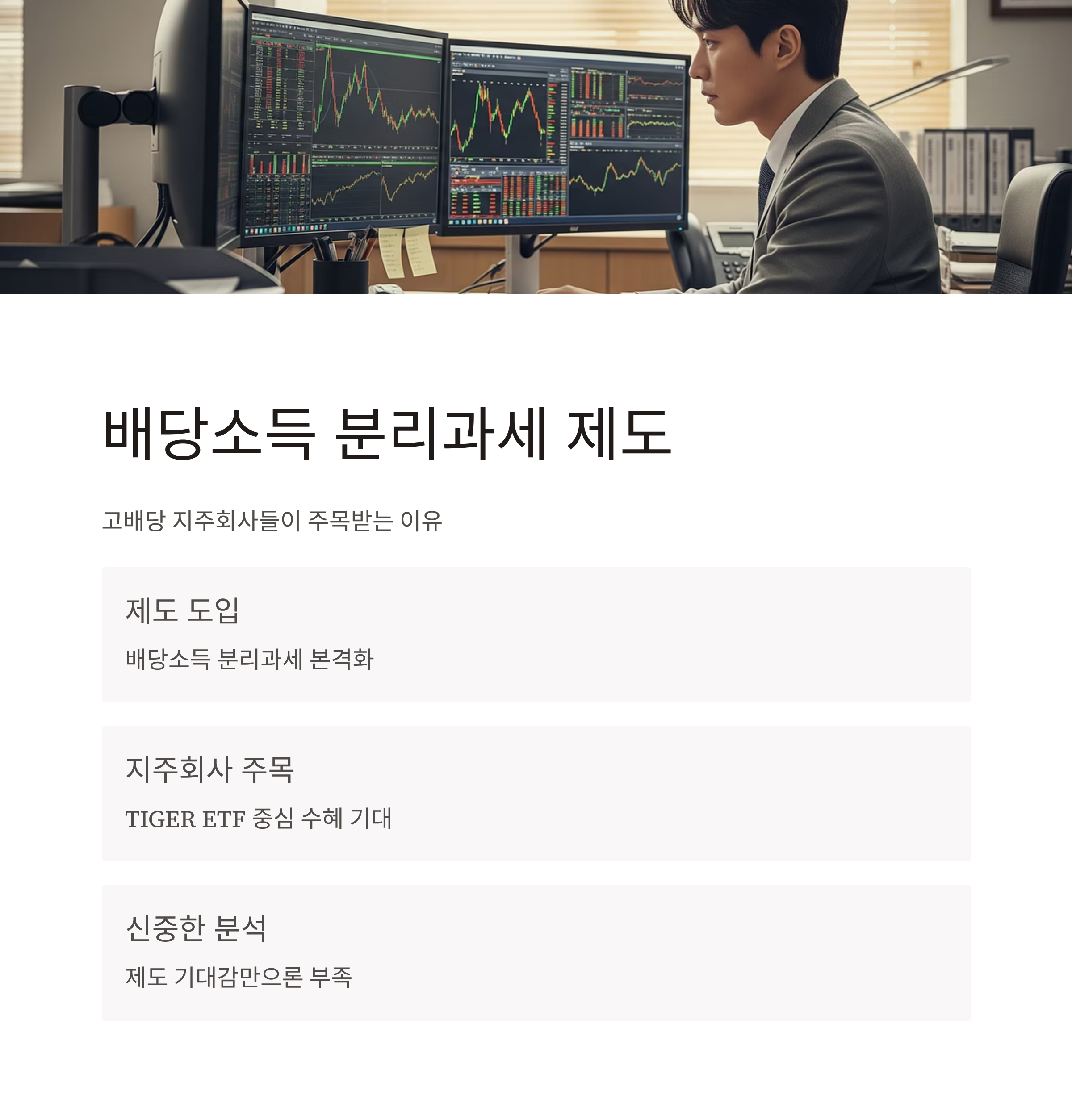 최근 주식시장에서 ‘배당소득 분리과세’ 제도 도입 움직임이 본격화되면서, 고배당 가능성이 있는 지주회사들이 주목받고 있습니다. 그 중심에 선 ETF가 바로 TIGER 지주회사 ETF입니다. 하지만 단순한 제도 기대감만으로 판단하긴 아직 이른 상황인데요. 이번 글에서는 해당 ETF의 기본 구조부터 제도 수혜 가능성, 투자 시 주의할 점까지 세 단계로 나눠 꼼꼼하게 분석해보겠습니다.