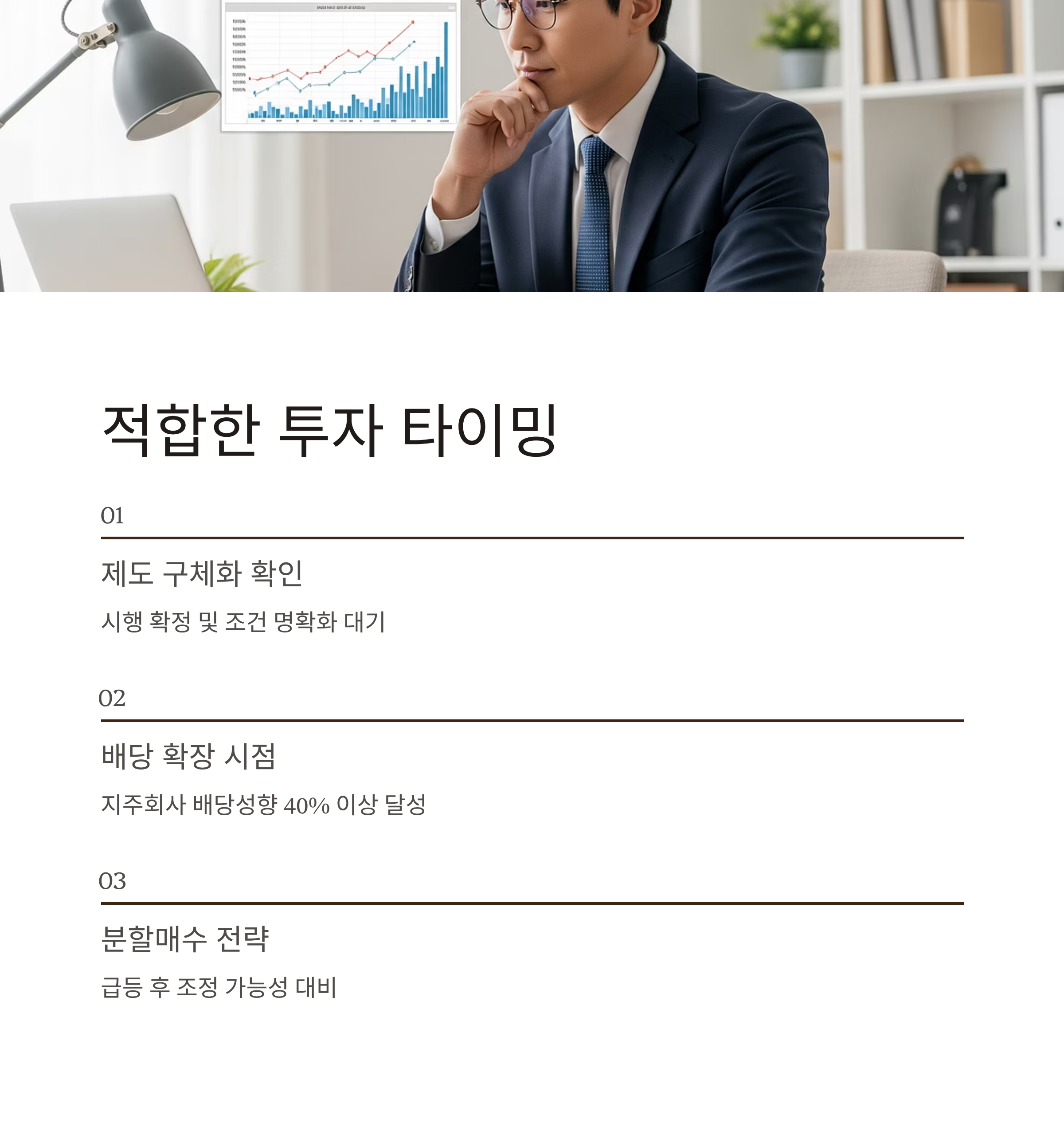 배당성향이 높아지는 시점, 또는 제도 적용 대상이 확정되는 뉴스 이후에 추격매수 타이밍을 고려해도 늦지 않습니다.