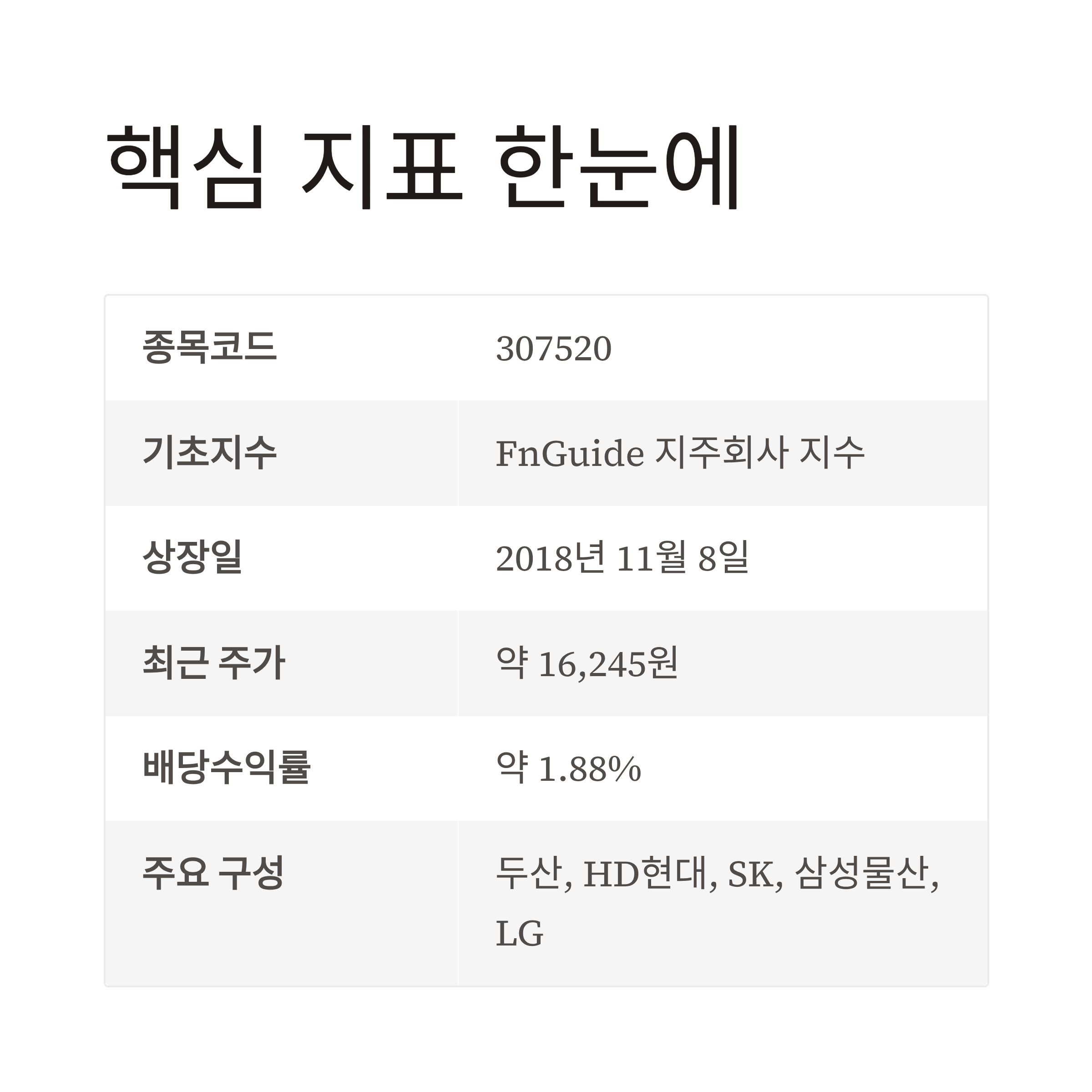 | 구성종목 상위 비중 | 두산, HD현대, SK, 삼성물산, LG 등 |
