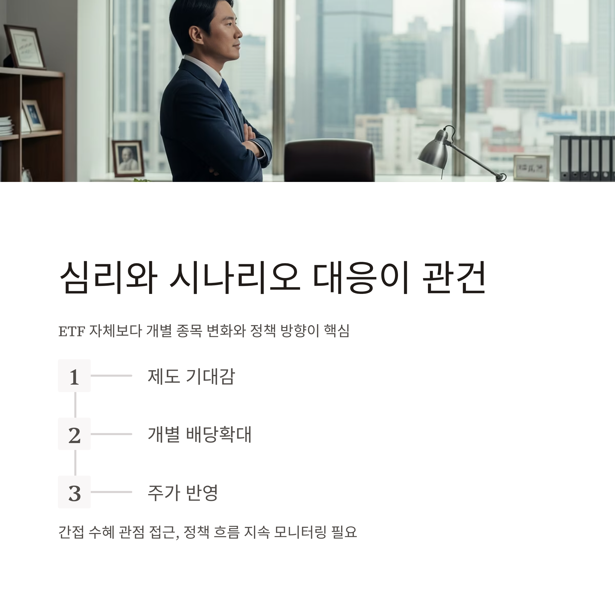 따라서 ‘제도 기대감 → 개별 배당확대 → 주가 반영’이라는 흐름을 미리 읽고, ETF를 간접 수혜 관점에서 접근하는 것이 바람직합니다. 단기 기대감보다는 정책 변화 흐름을 꾸준히 지켜보며 대응하는 것이 안정적인 투자 전략이 될 것입니다.