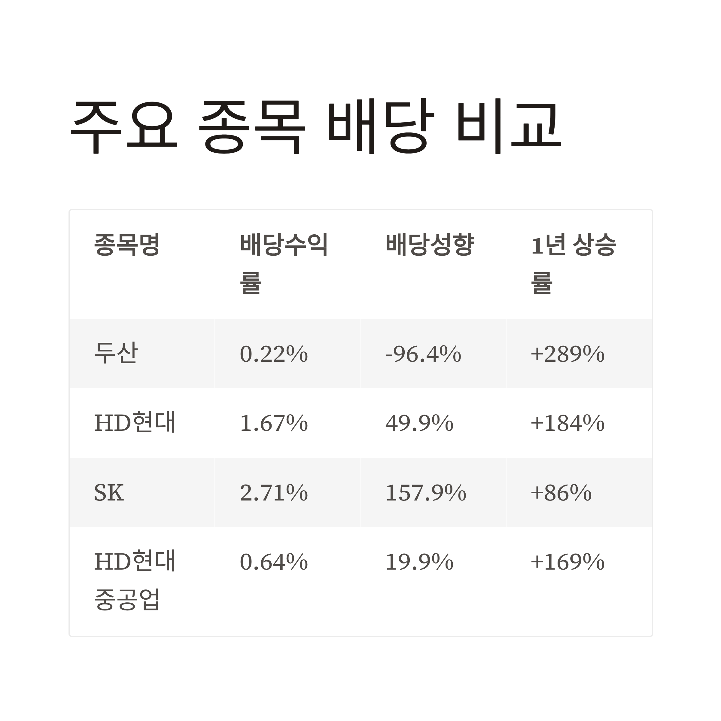 | 두산 | 약 0.22% | –96.4% | 약 +289% |