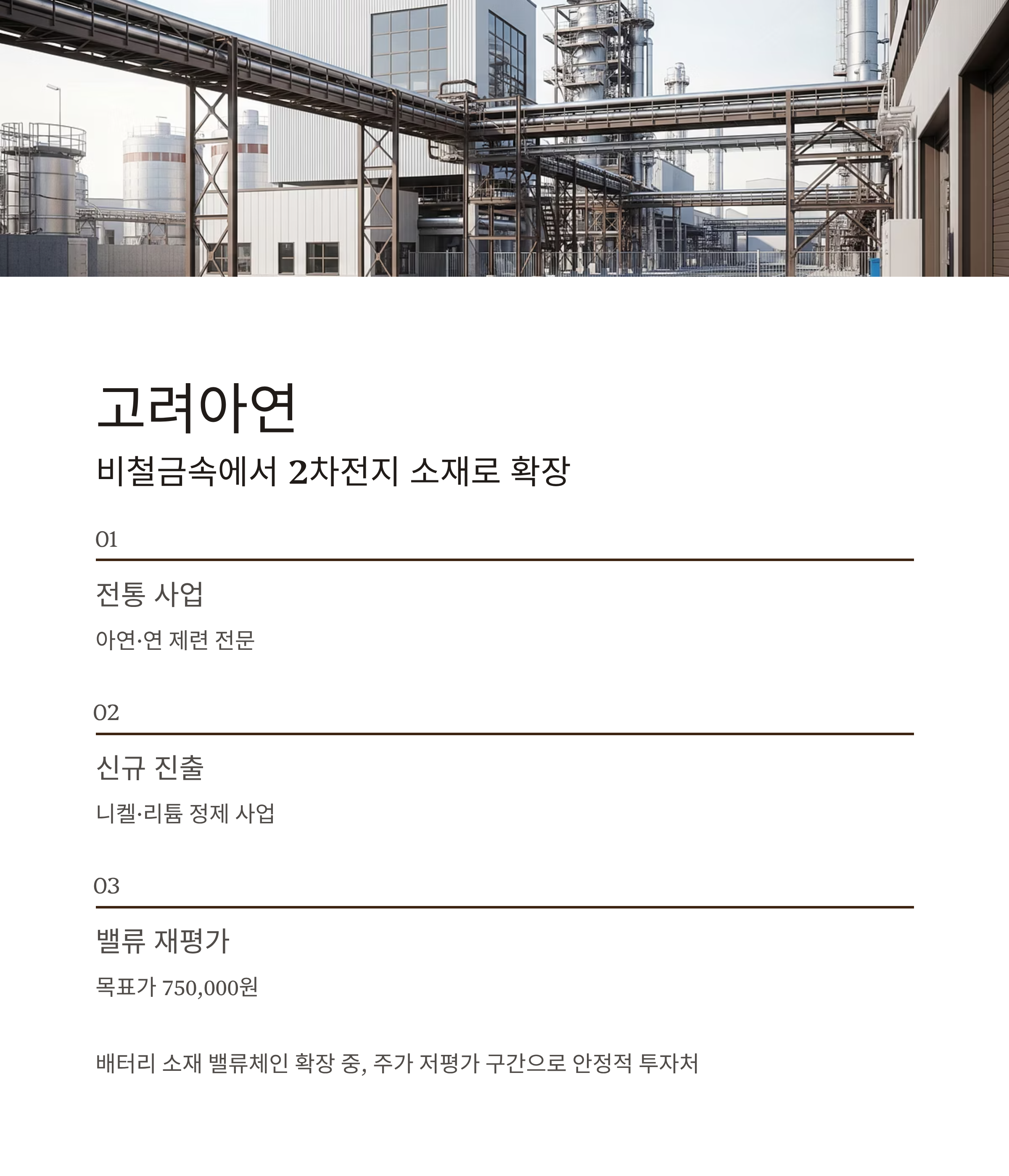 고려아연은 다변화된 사업 구조 속에서 배터리 소재 진출을 확대 중인 안정형 투자 카드로,