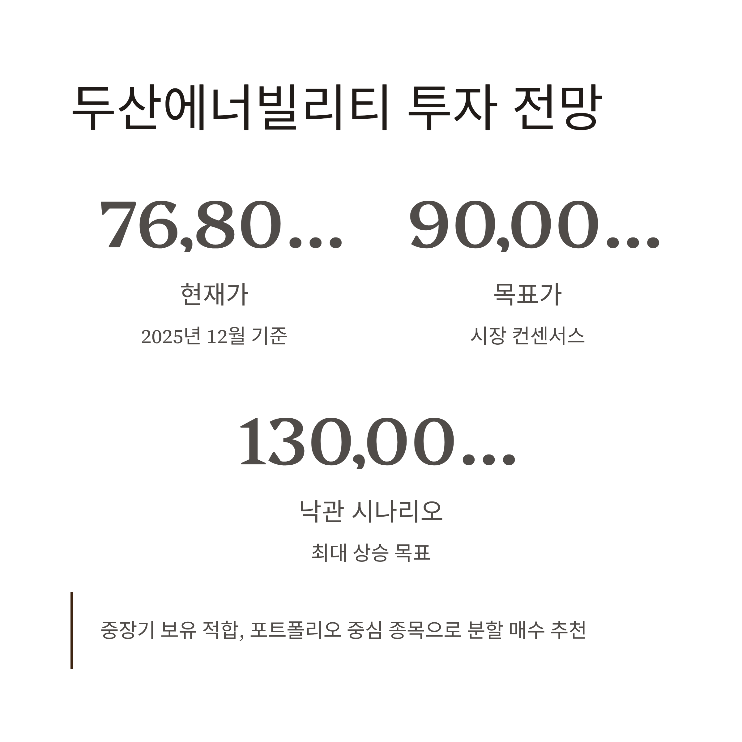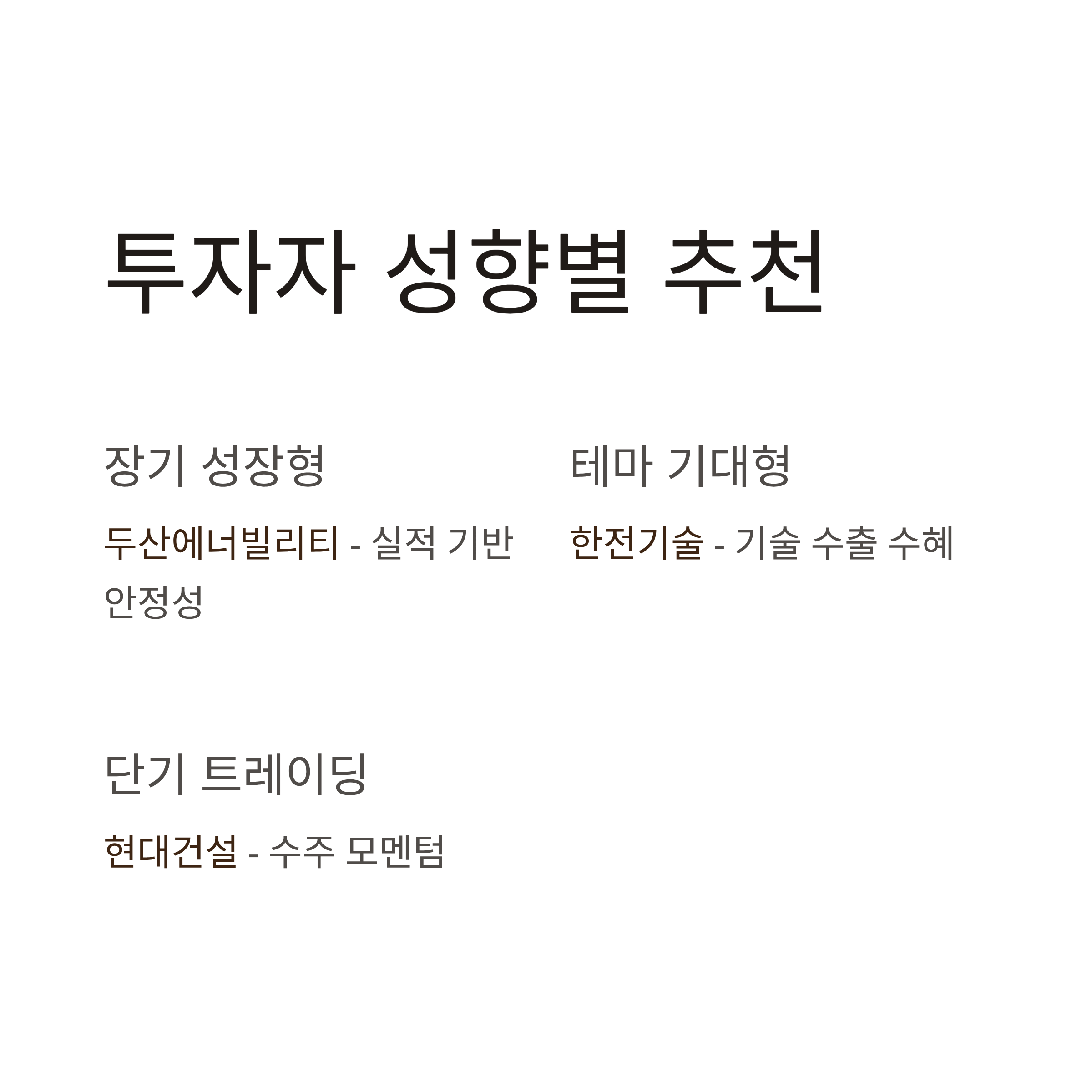 | 장기 성장 + 안정성 | 두산에너빌리티 | 실적 기반 + 수주 가시화 + 탄소중립 핵심 장비 보유 |