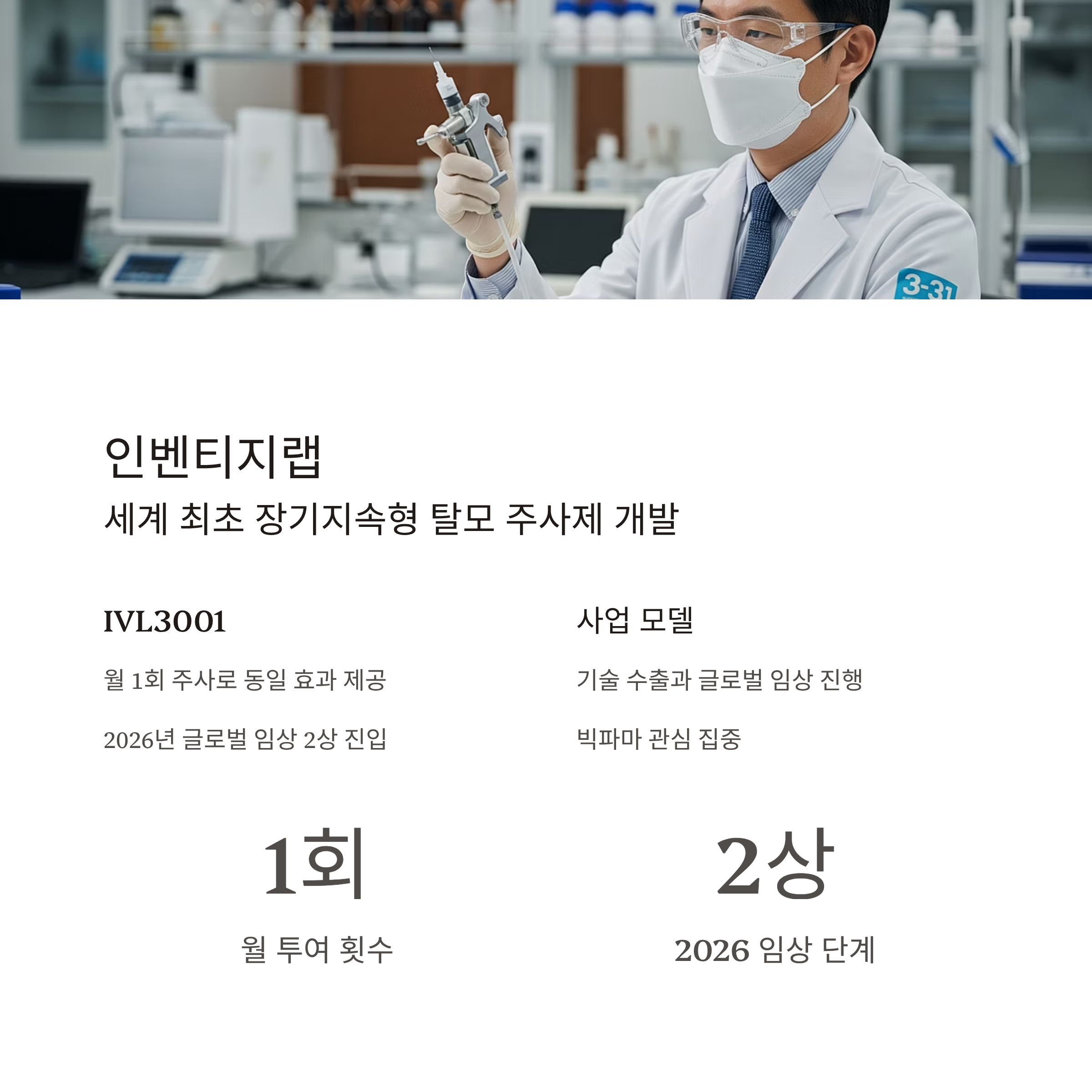 | 핵심 파이프라인 | IVL3001 (탈모 주사제) |