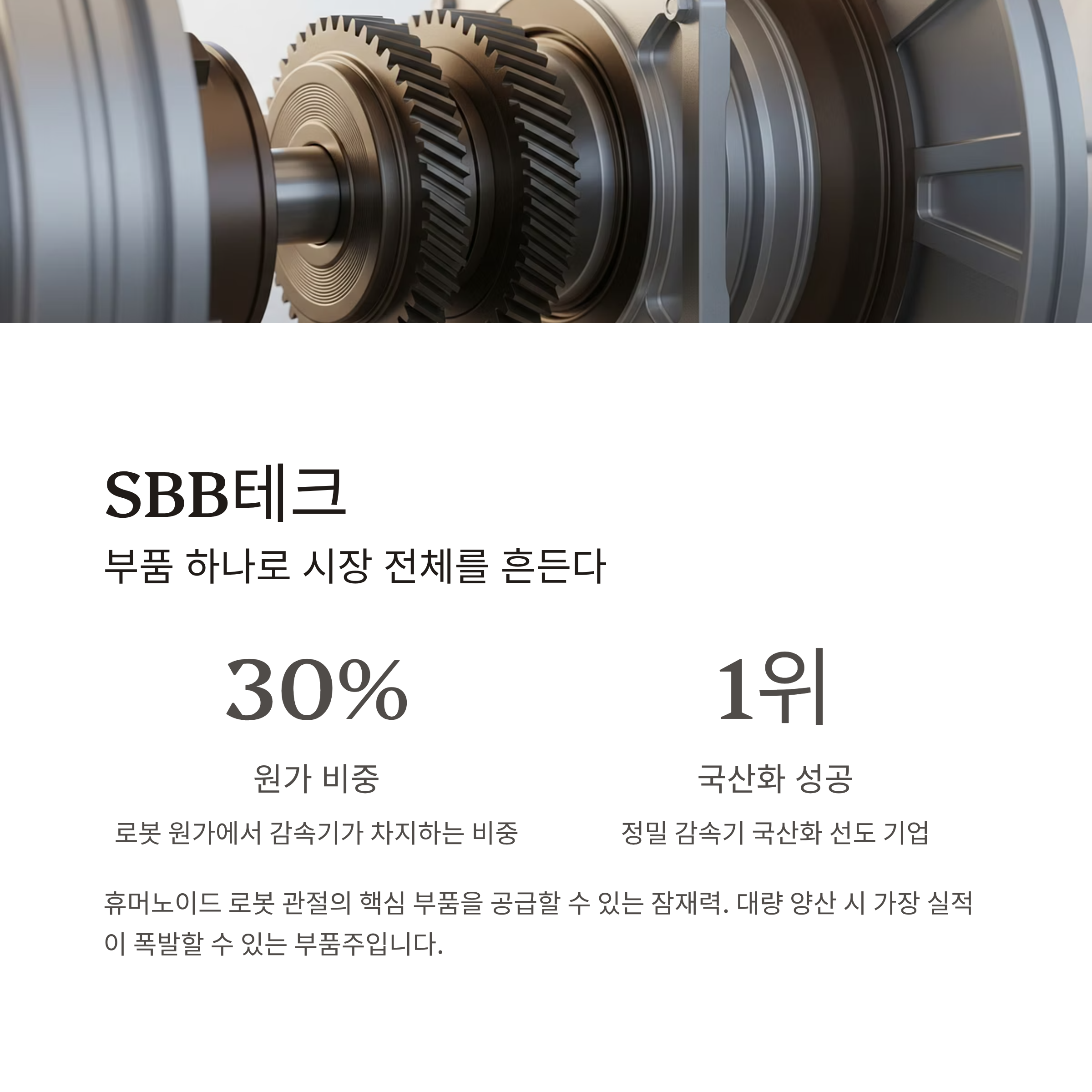 SBB테크는 정밀 감속기 국산화에 성공한 몇 안 되는 기업으로, 옵티머스 같은 휴머노이드 로봇에 반드시 필요한 부품을 공급할 수 있는 잠재력을 보유하고 있습니다.