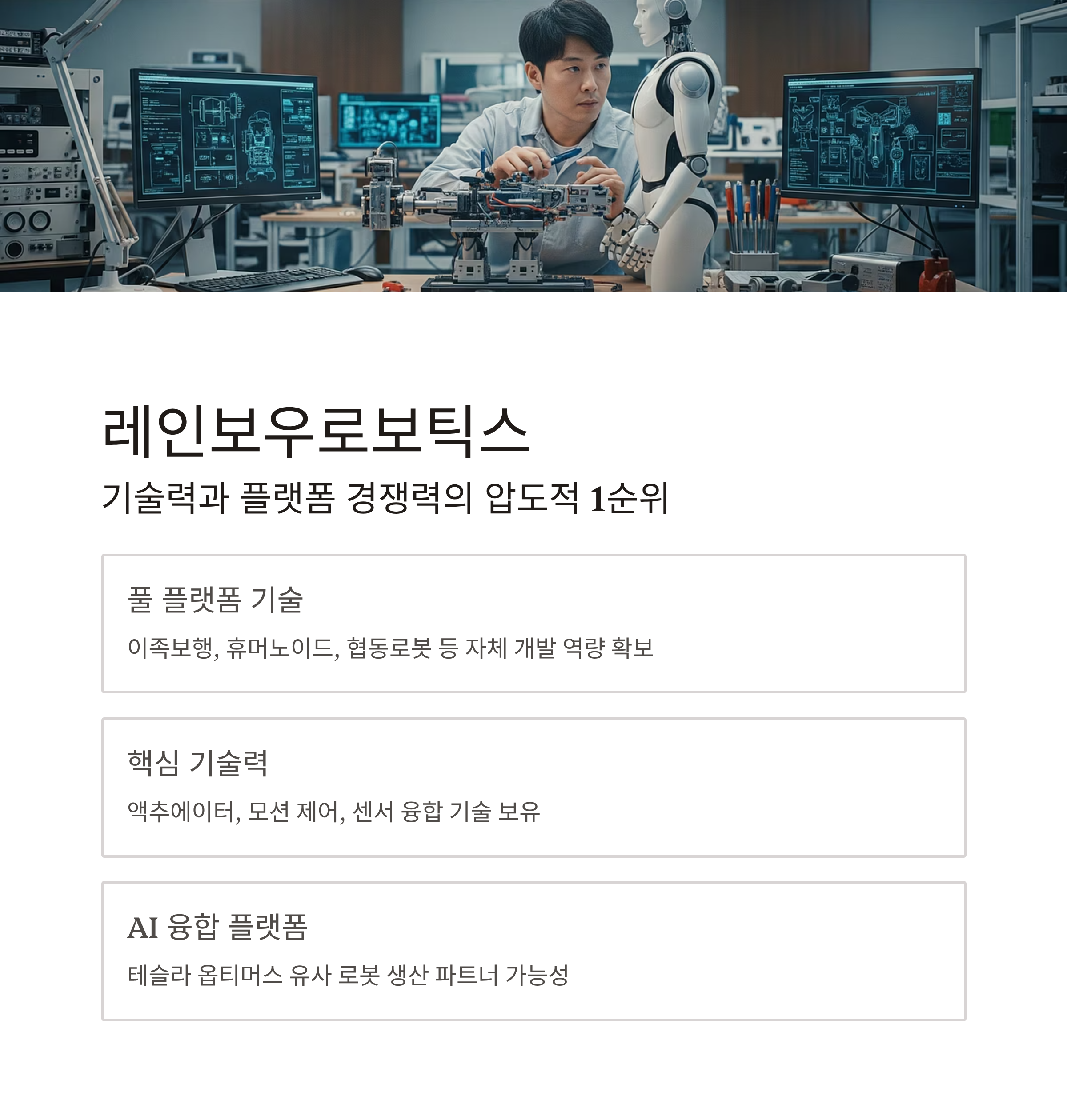 | 기술 우위 | 레인보우로보틱스 → 이족보행 기반 플랫폼 확보 |