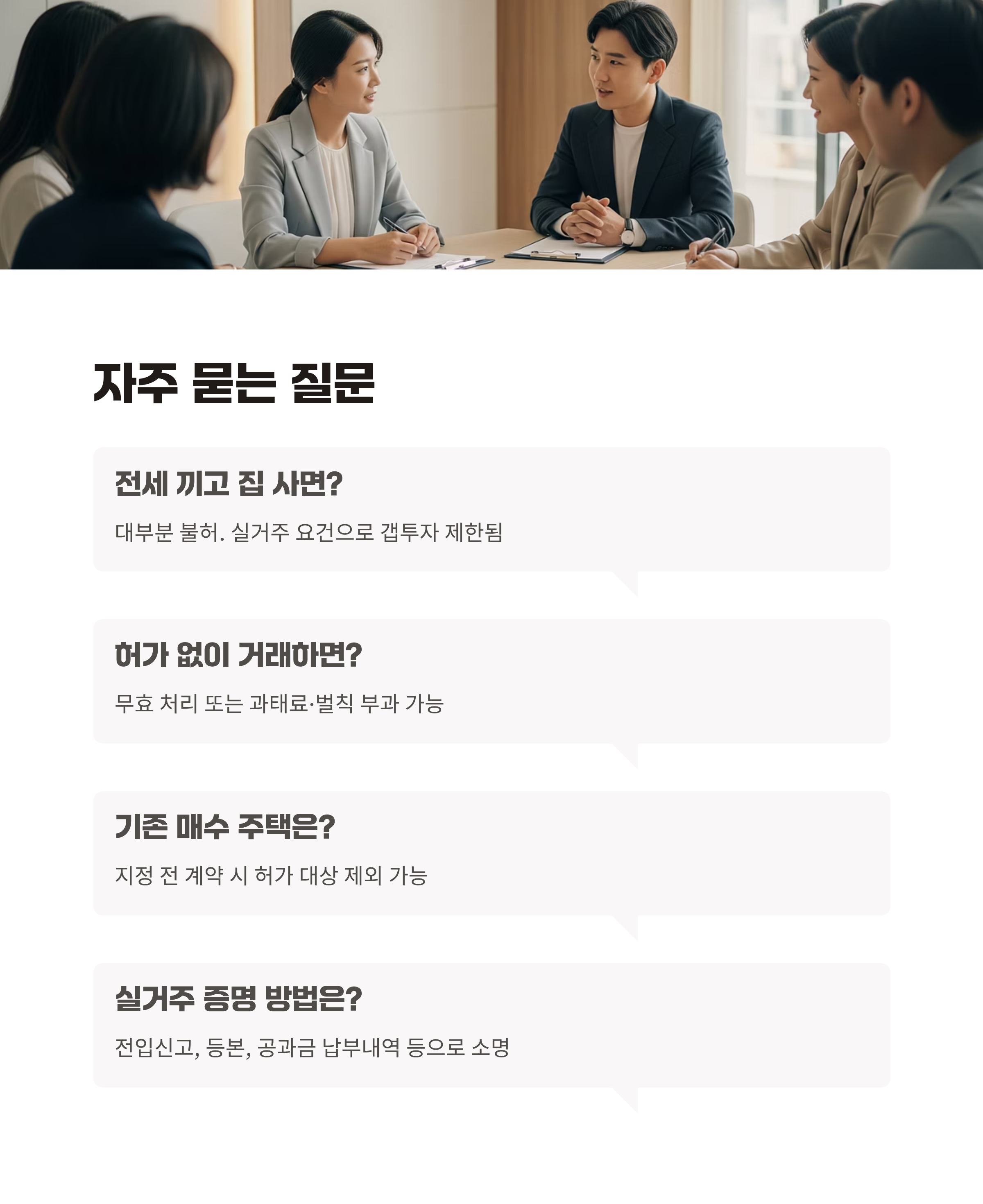 | 전세 끼고 집 사면 허가 나나요? | 대부분 불허. 실거주 요건 때문에 갭투자 형태 매매는 제한됨 |