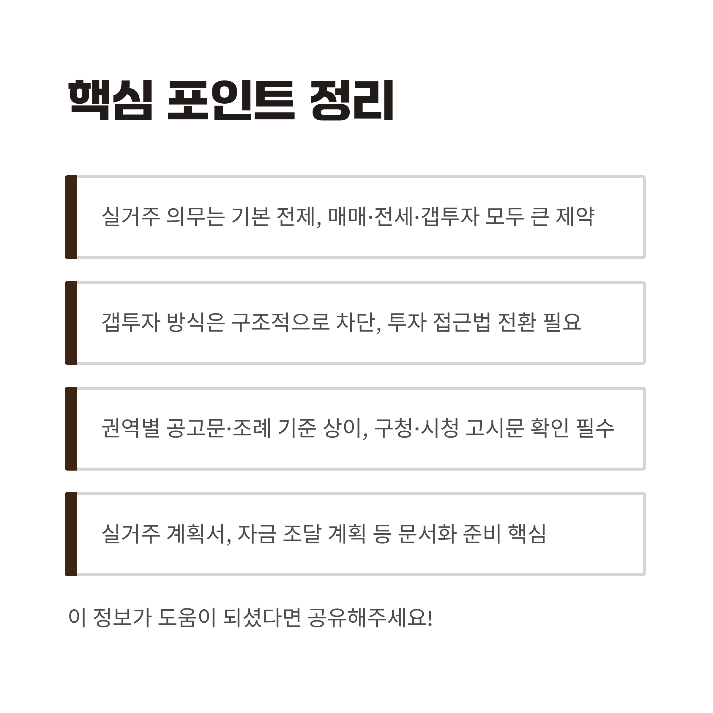 - 갭투자 방식은 구조적으로 차단되거나 허가 거절 가능성이 높으며, 투자 접근법 자체를 바꿔야 할 상황입니다.