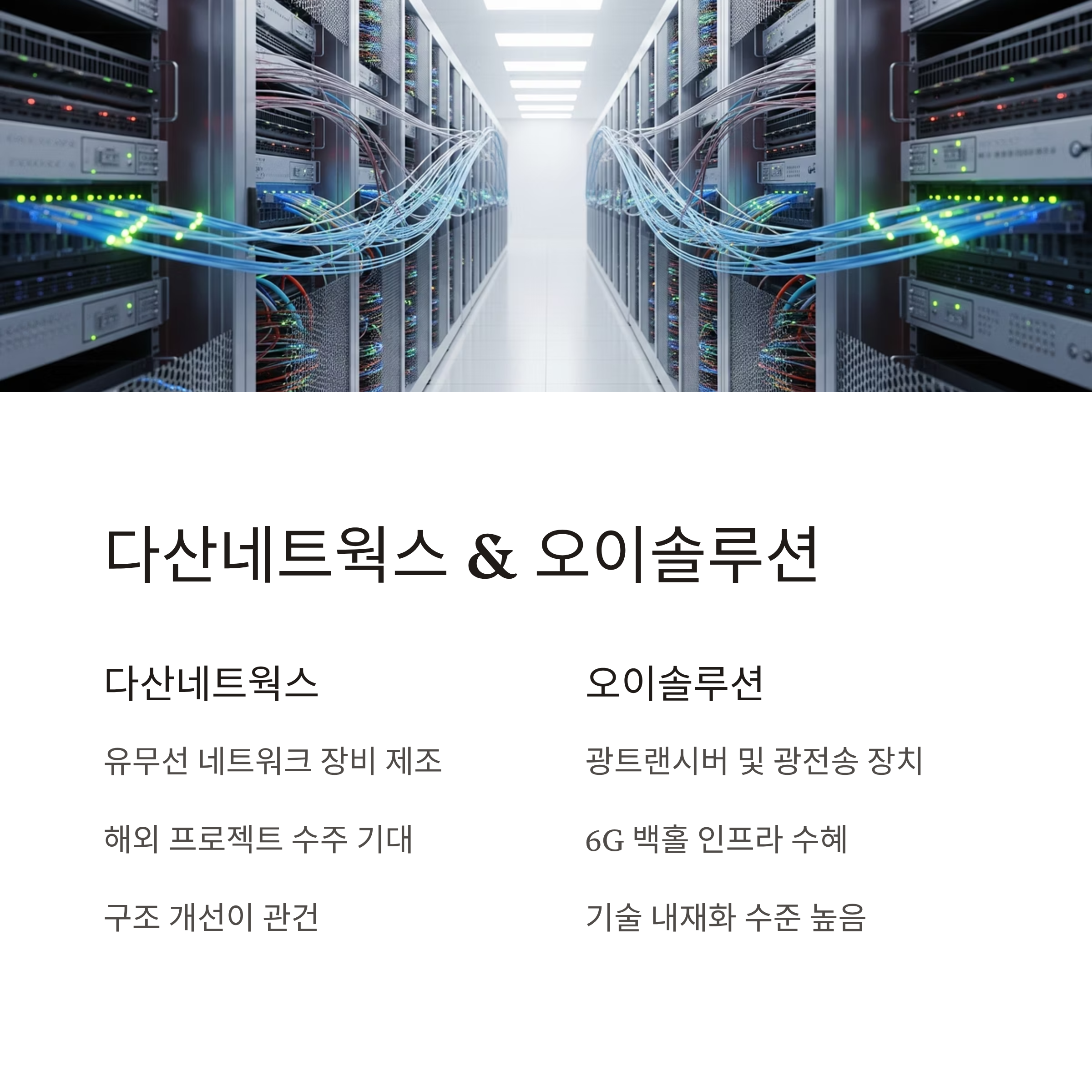 | 다산네트웍스 | 중하 | 해외 수출 / 글로벌 인프라 연계 가능 | 업황 부진 / 구조적 실적 약화 |