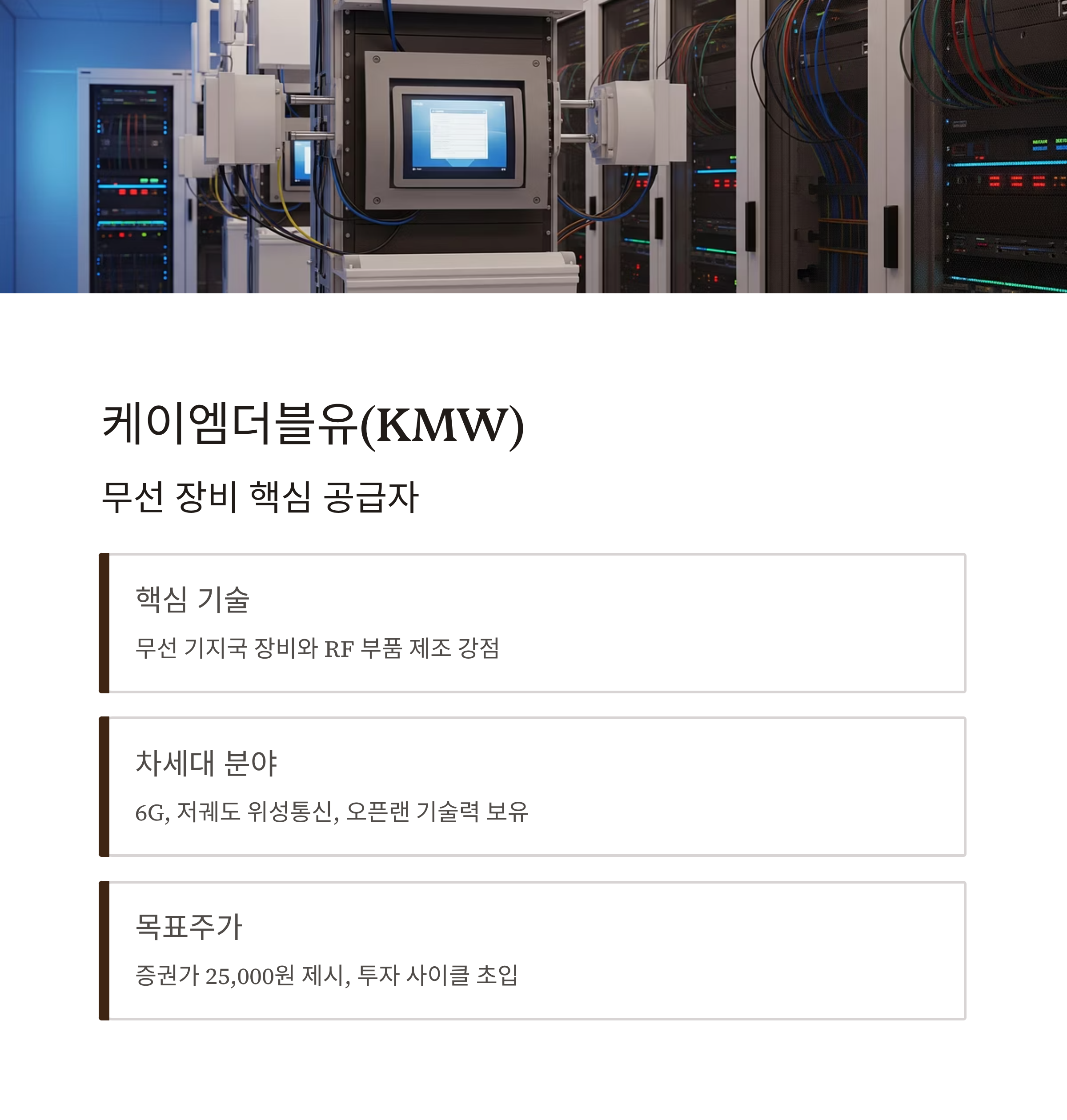 케이엠더블유는 무선 기지국 장비와 RF 관련 부품 제조에 강점을 가진 통신장비 대표 기업입니다. 특히 6G, 저궤도 위성통신, 오픈랜(Open RAN) 등 차세대 인프라 분야에서 기술력을 보유한 만큼, 중장기적으로 재평가 받을 가능성이 높습니다.