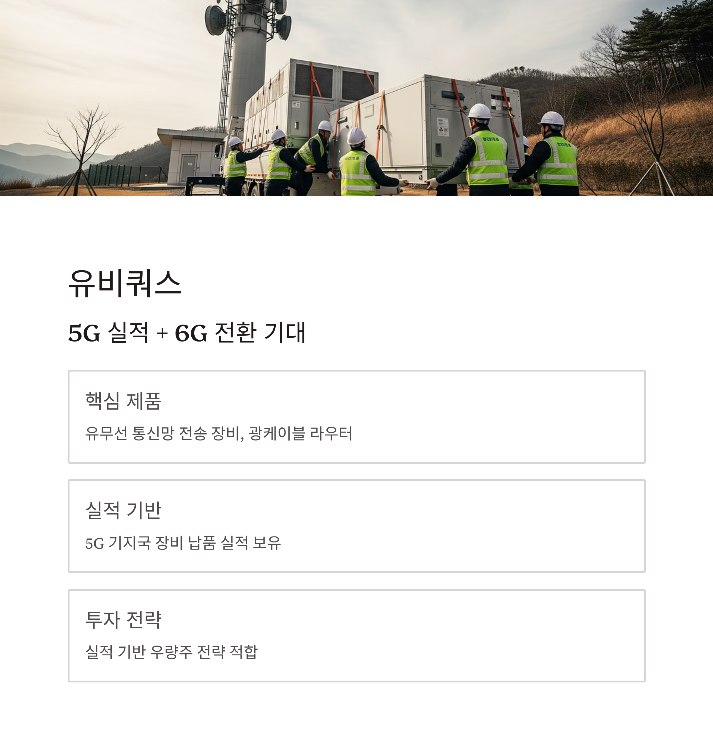 | 유비쿼스 | 5G 전송장비 / 통신기기 실적 기반 | 안정성 중시 투자자에게 적합 |