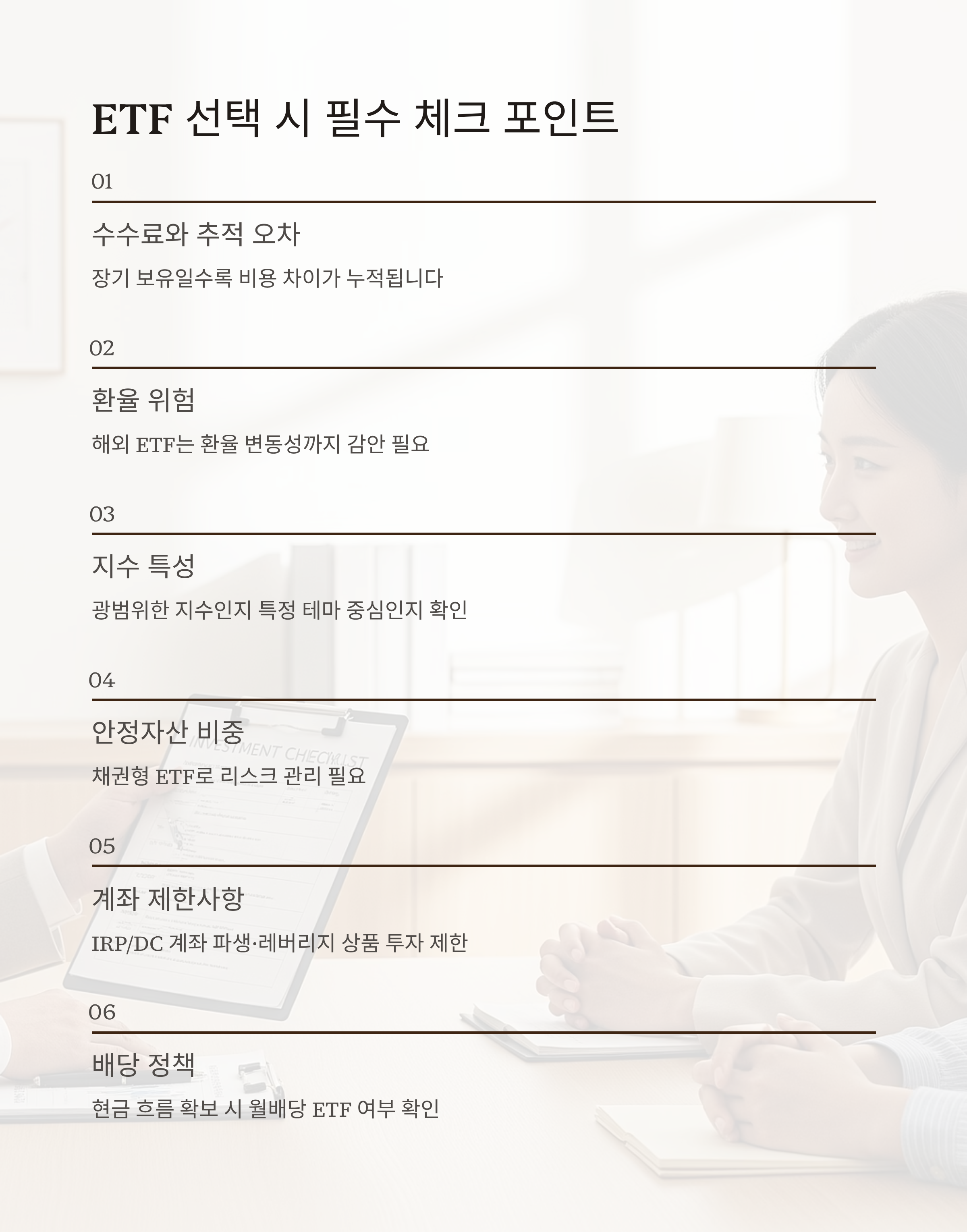 퇴직연금 계좌에서 ETF를 선택할 때는 단순히 수익률만 보지 말고 다음을 고려해야 합니다.