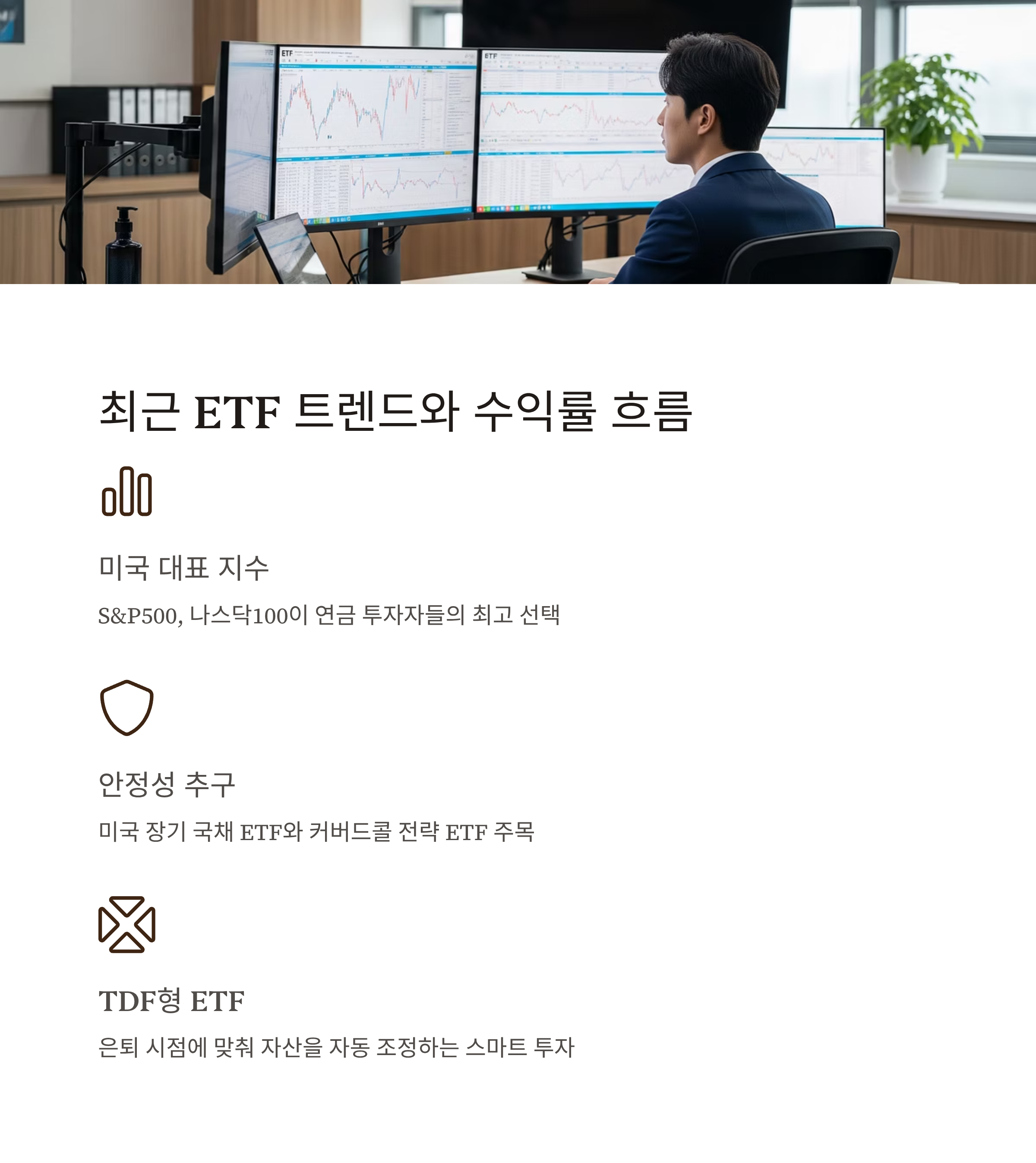 연금 투자자들이 가장 많이 선택하는 건 미국 대표 지수를 추종하는 ETF입니다. S&P500, 나스닥100, 그리고 미국 테크 중심 종목들이 높은 비중을 차지하고 있습니다. 하지만 변동성을 줄이고 싶다면 미국 장기 국채 ETF나 커버드콜 전략 ETF, 그리고 은퇴 시점에 맞춰 자산을 자동 조정하는 TDF형 ETF도 주목할 만합니다.