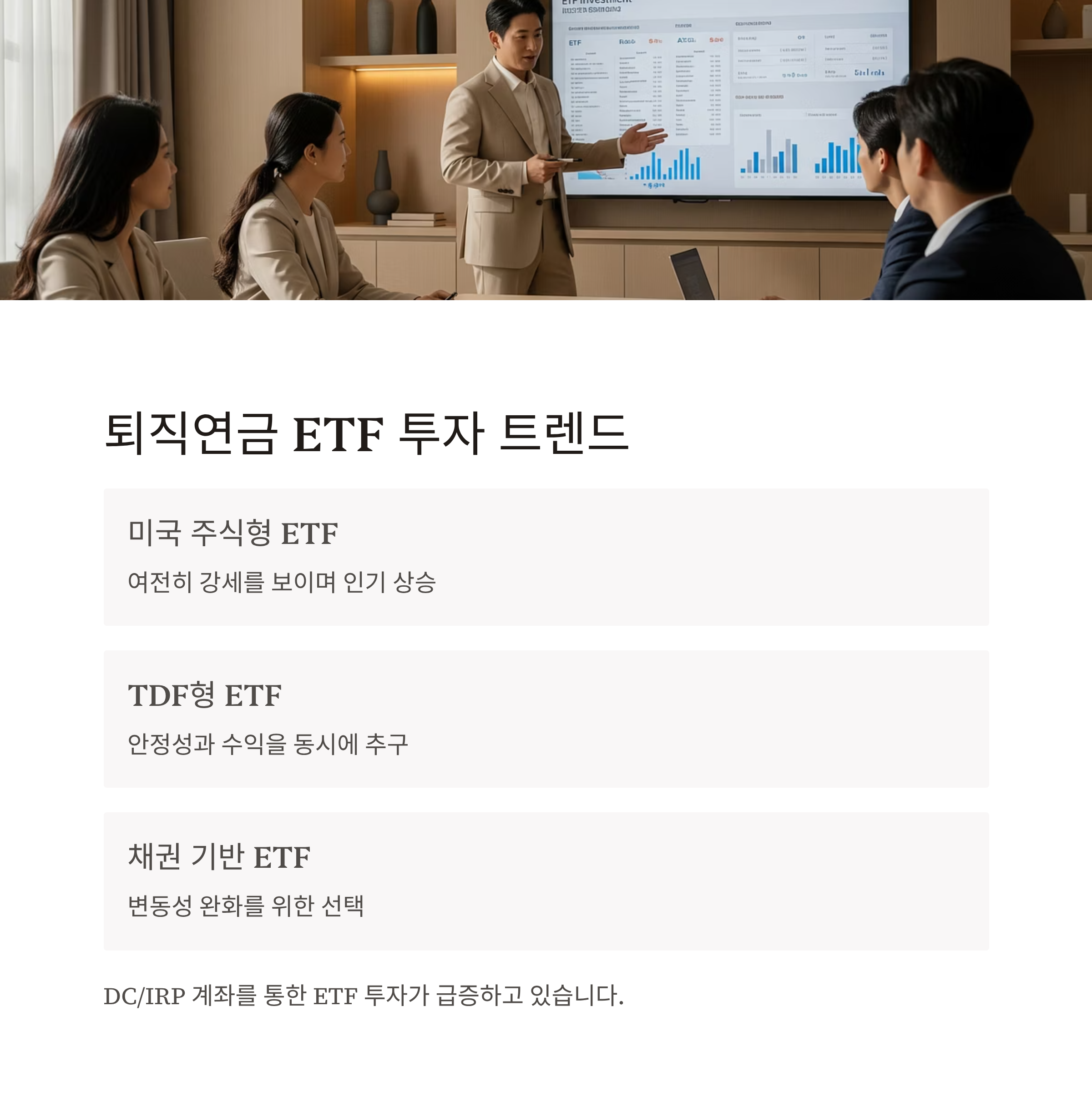 퇴직연금(DC/IRP) 계좌를 통해 ETF에 투자하는 분들이 점점 늘어나고 있습니다. 최근 흐름을 보면 미국 주식형 ETF가 여전히 강세를 보이고 있으며, 안정성과 수익을 동시에 노릴 수 있는 TDF형 ETF나 채권 기반 ETF도 인기를 끌고 있습니다. 오늘은 인기 있는 ETF TOP 5와 최근 수익률 흐름, 그리고 나에게 맞는 ETF를 고르는 비교 포인트까지 한 번에 정리해 드립니다.