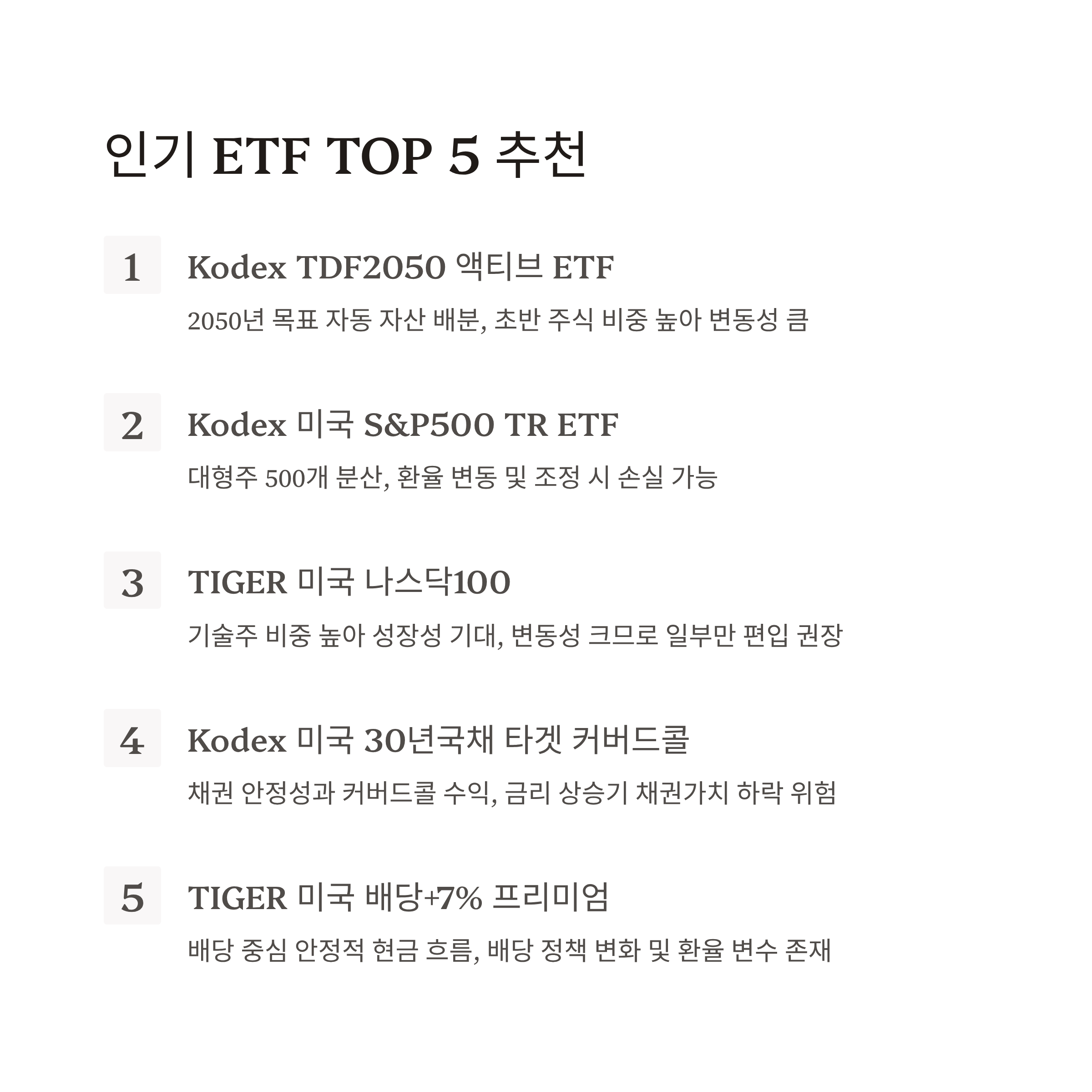 | 5 | TIGER 미국 배당+7% 프리미엄 다우존스 | 배당 중심 + 안정적 현금 흐름 | 배당 정책 변화, 환율, 세금 변수 존재 |