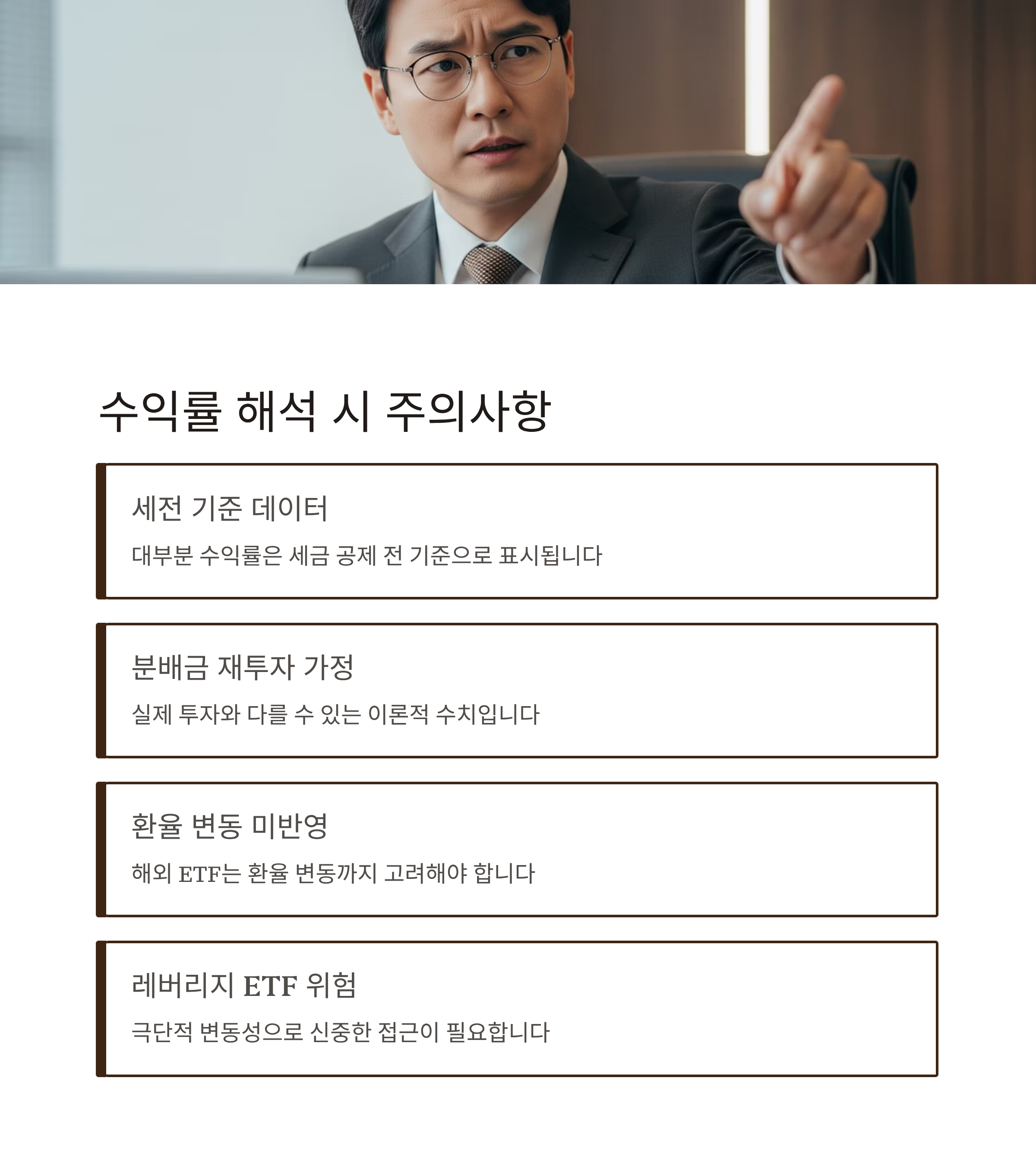 수익률 데이터는 대부분 세전 기준이며, 분배금 재투자를 가정한 경우가 많습니다. 실제 투자 수익은 세금, 비용, 환율 변동까지 반영해야 하므로 단순 수치만 보고 판단하면 위험합니다. 특히 레버리지나 테마형 ETF는 수익률 변동이 극단적으로 크기 때문에 신중하게 접근해야 합니다.