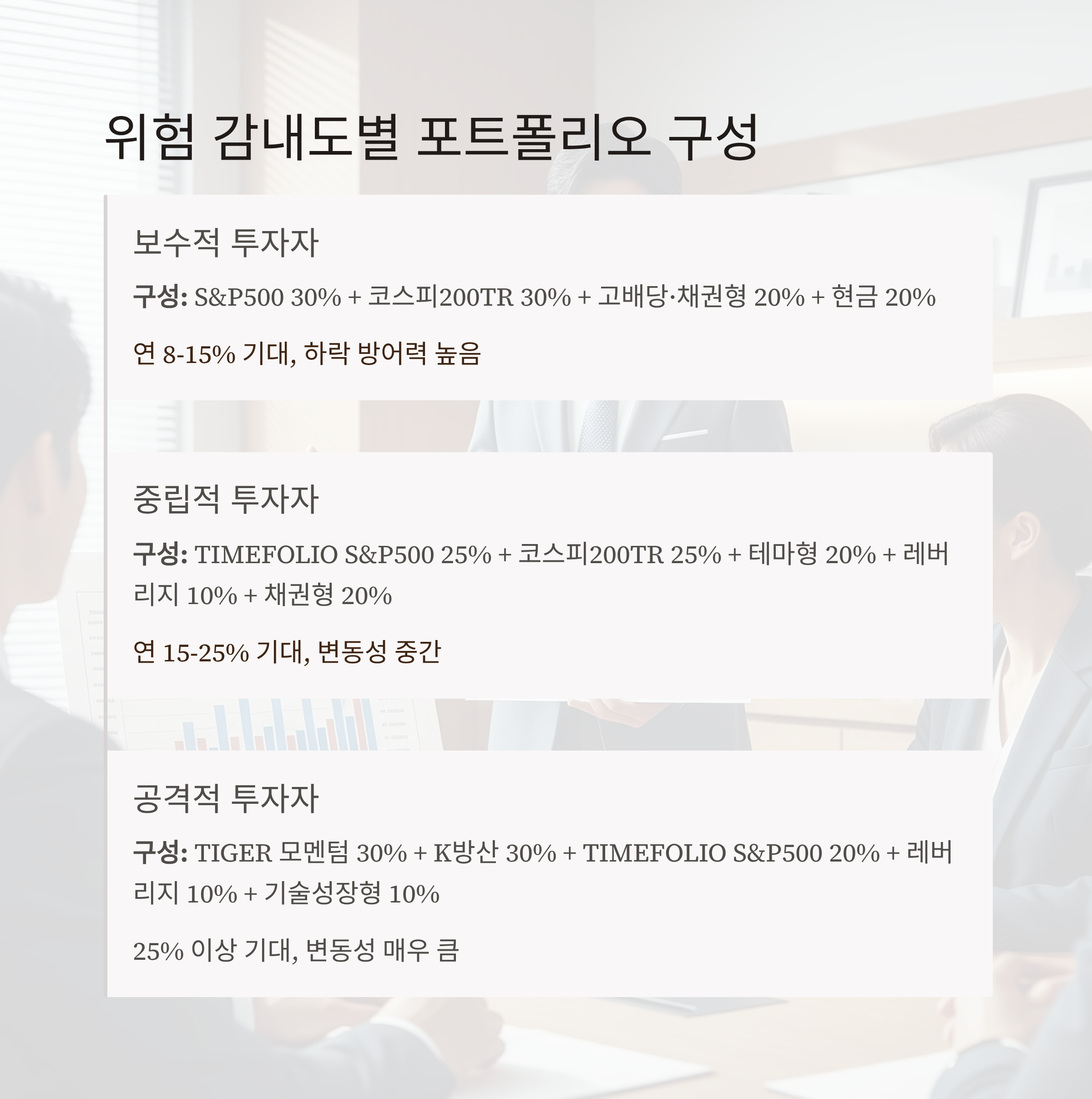 | 중립적 | 성장과 안정 균형 | TIMEFOLIO S&P500 액티브 25% / 코스피200TR 25% / 테마형 20% / 레버리지 소량 10% / 채권형 20% | 연 15~25% 기대, 변동성 중간 |