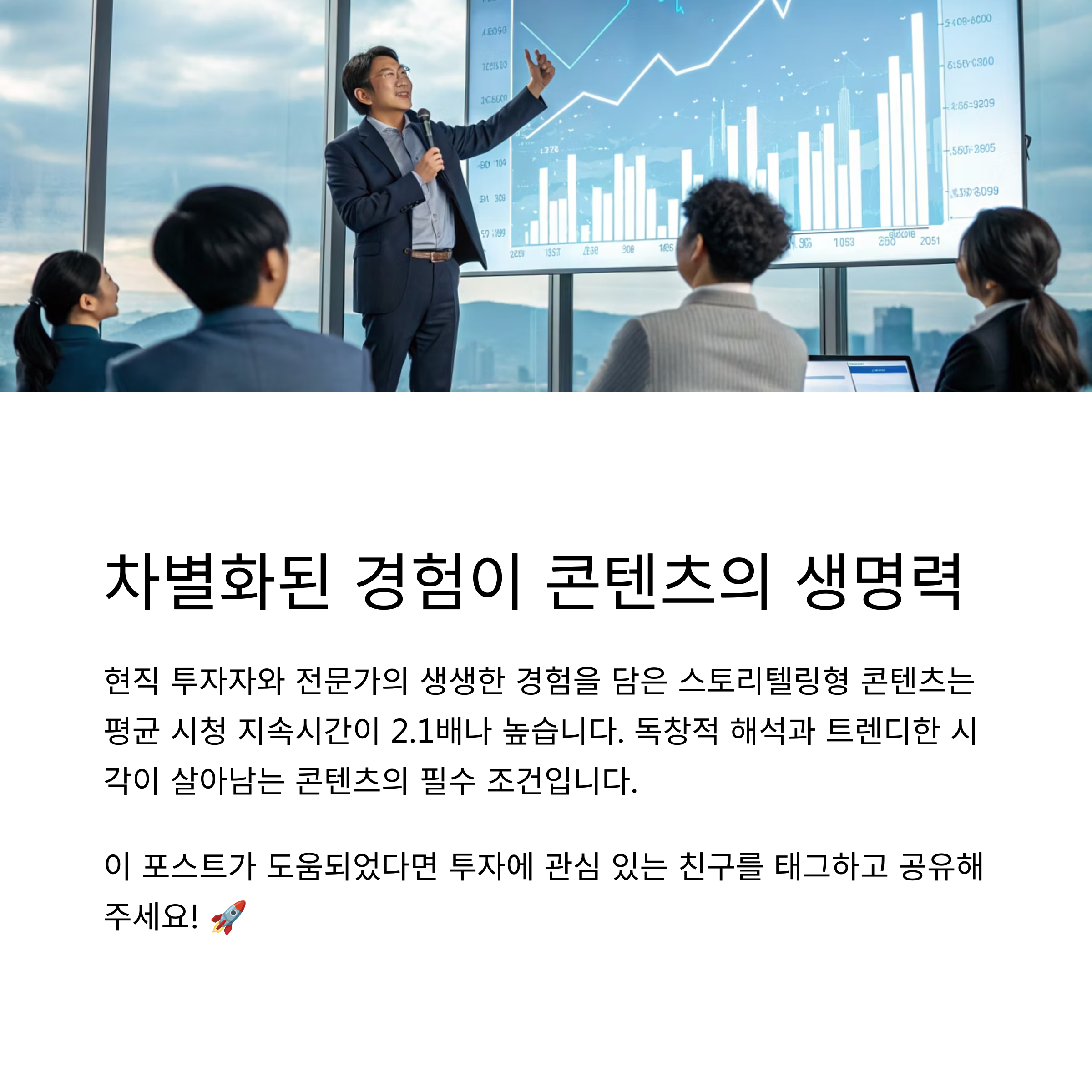 투자 콘텐츠는 여전히 수요가 높고, 전문성과 신뢰를 쌓을 수 있는 강력한 영역입니다. 그러나 정보만 나열된 콘텐츠는 이제 주목받기 어렵습니다. 시대 흐름에 맞는 주제 선정과 개인의 경험을 담은 콘텐츠가 살아남습니다. 지금까지 경험한 작고 사소한 투자 이야기라도, 누군가에게는 큰 영감이 될 수 있습니다. 지금 바로, 콘텐츠로 공유해 보세요.