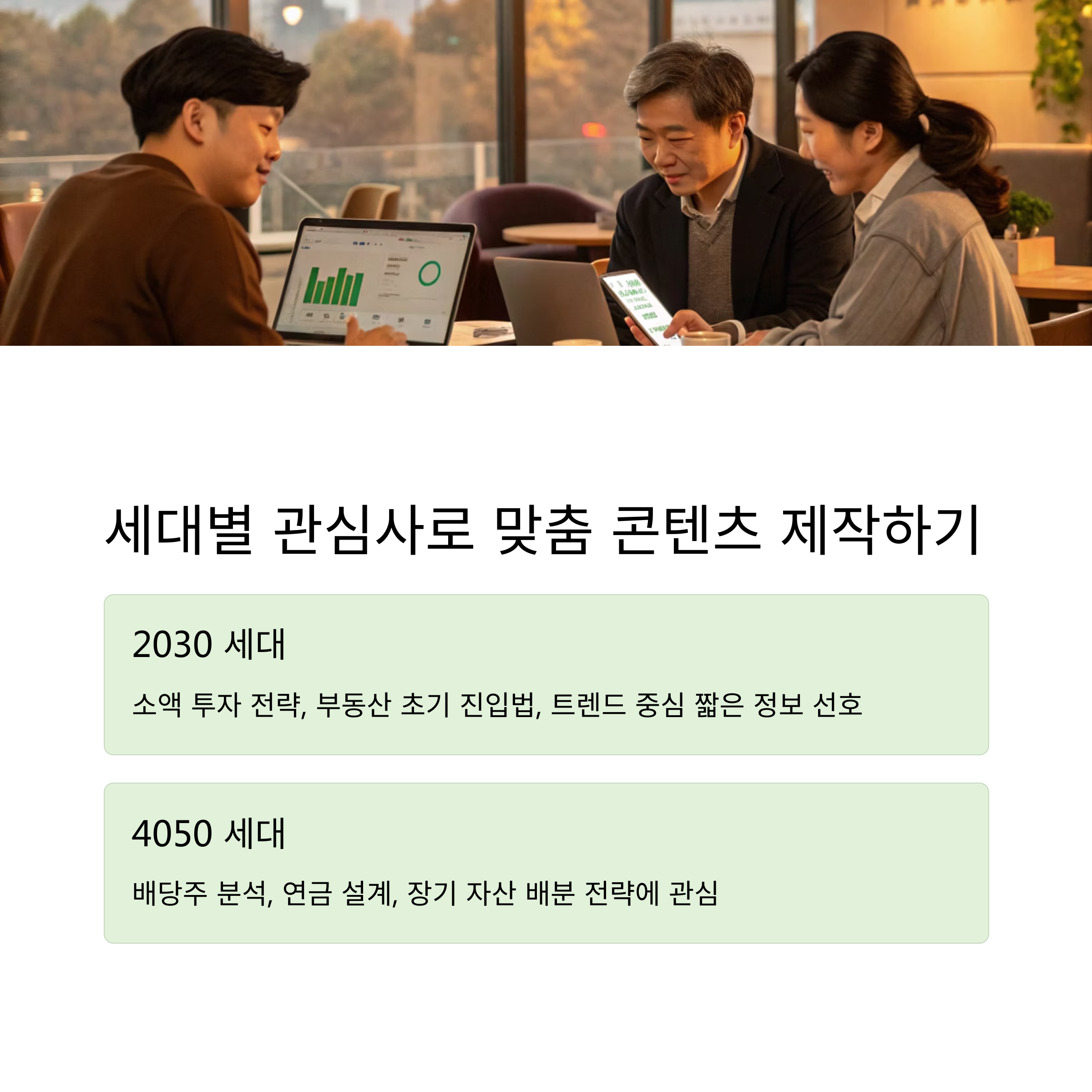 투자 콘텐츠를 만들 때 가장 중요한 건 ‘누가 소비하는가’입니다. 주식 투자에 관심 있는 2030과, 부동산에 민감한 4050 세대는 전혀 다른 관심사를 가지고 있습니다. 콘텐츠의 목표 대상을 정하고 그들이 자주 검색하거나 궁금해하는 주제를 선정하는 것이 핵심입니다. 예를 들어, “20대 첫 월급 투자법”, “ETF로 연금 만들기”, “월세 수익으로 은퇴 준비하기”처럼 세대별·상황별 맞춤 주제는 클릭률이 훨씬 높습니다.