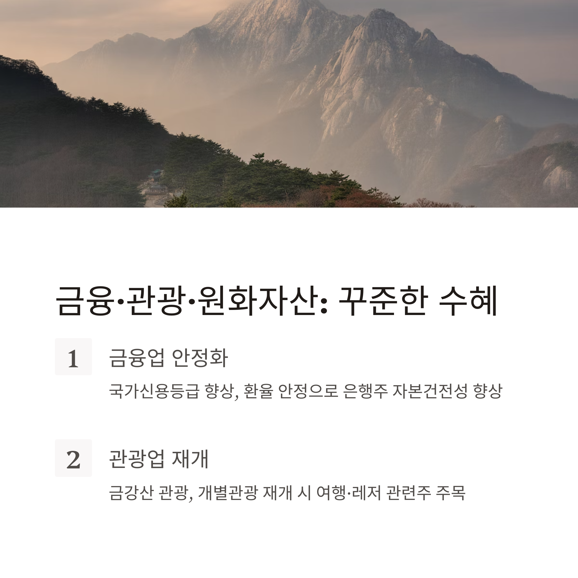 | 금융·관광 | 환율 안정, 신용등급 기대 | 관광 재개 시 추가 상승 여지 | 영향 미미 |
