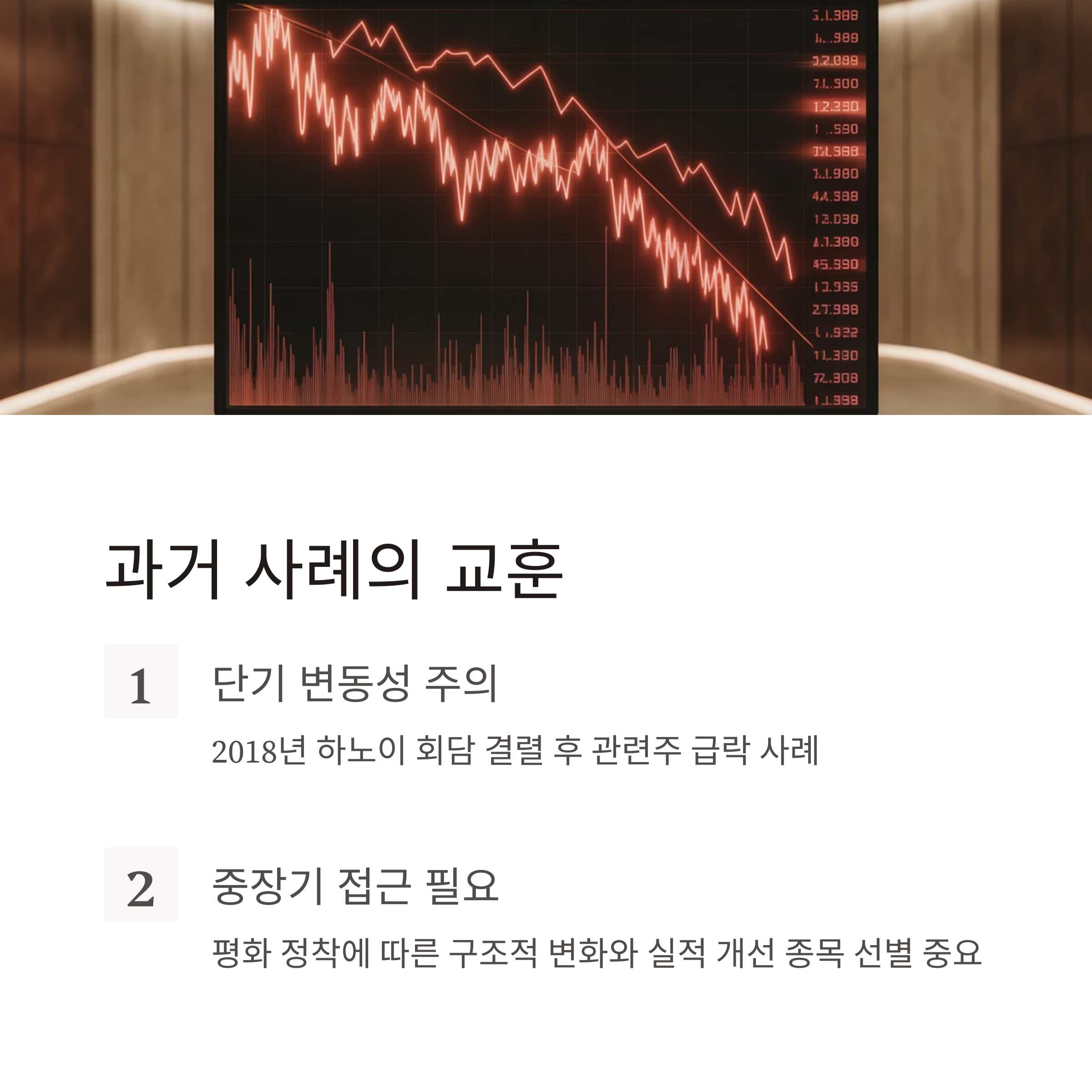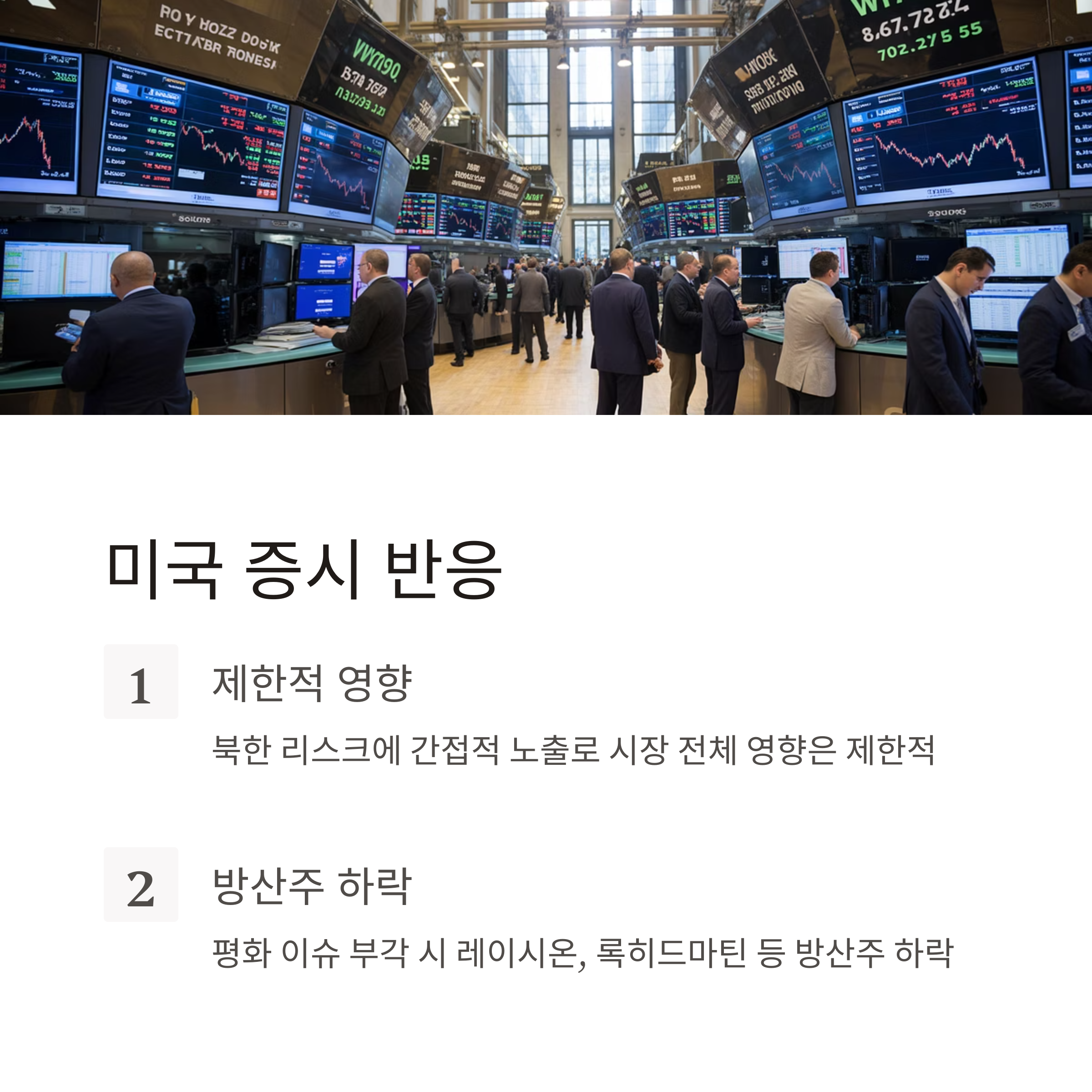 예: 2018년 6월 북미정상회담 직후 레이시온 -2.6%, 록히드마틴 -1% 하락.