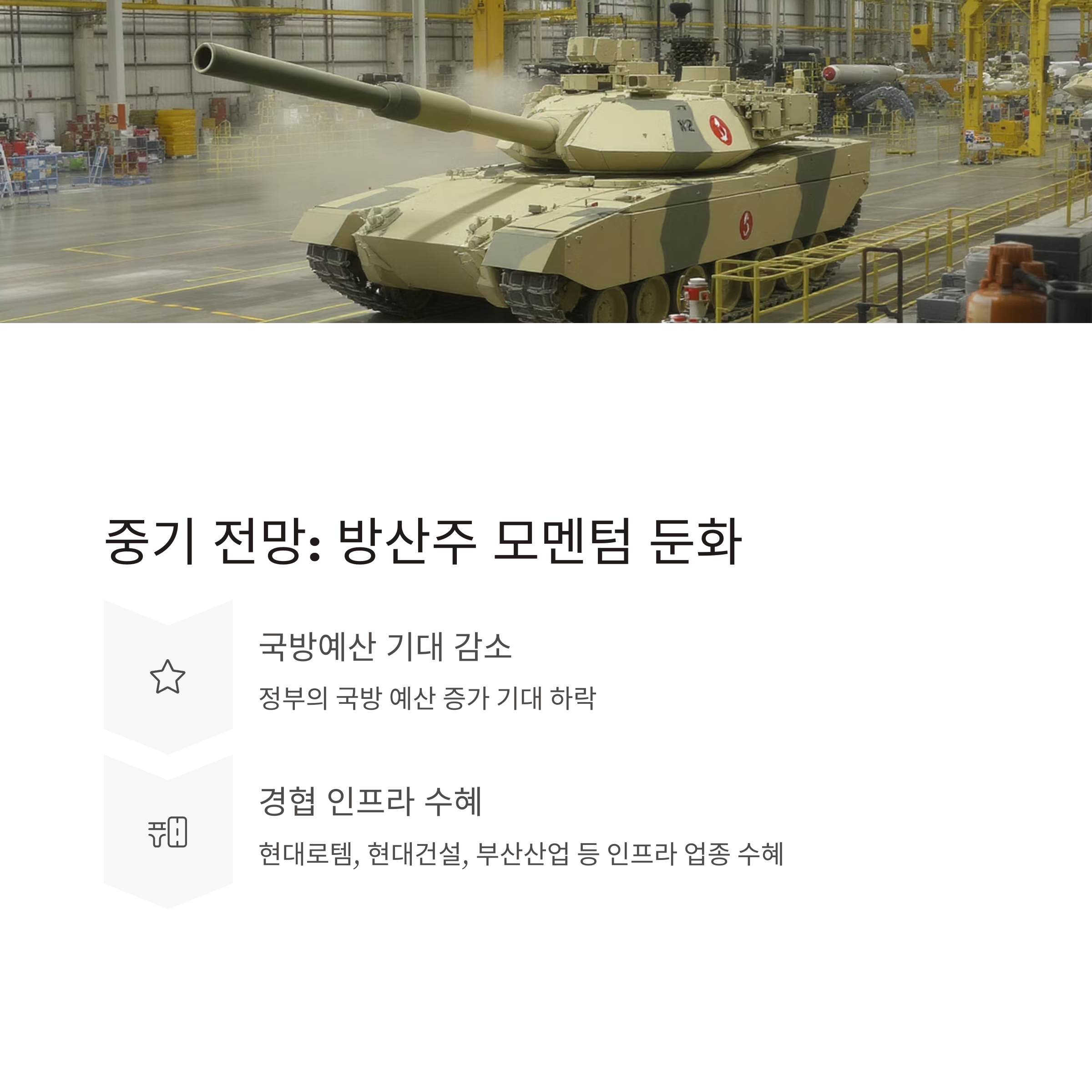 중기: 군비 감소 우려에 방산주 모멘텀 둔화, 대신 경협 인프라 수혜 부각
