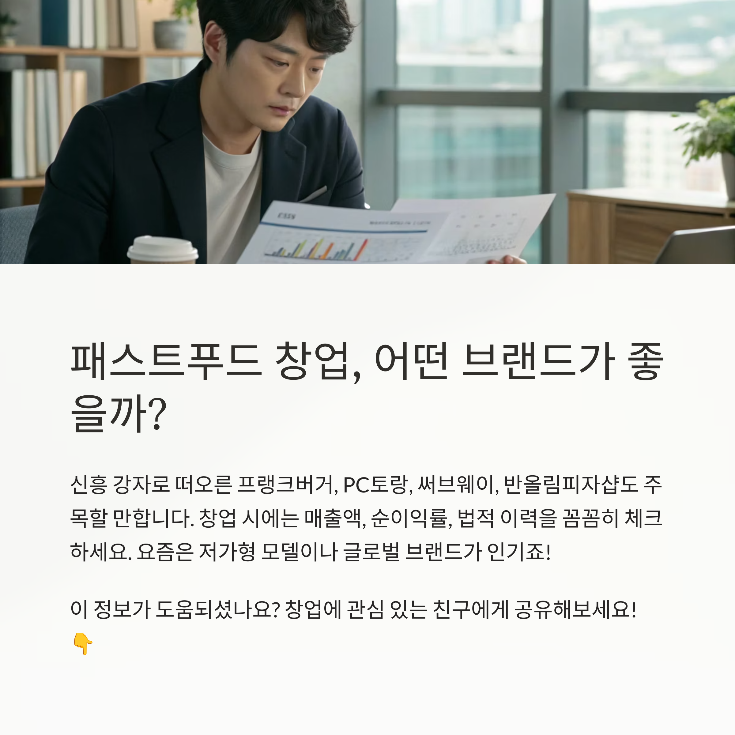 맥도날드, 롯데리아, 버거킹 등의 대형 브랜드는 안정적 입지를 기반으로 검토해도 좋습니다.