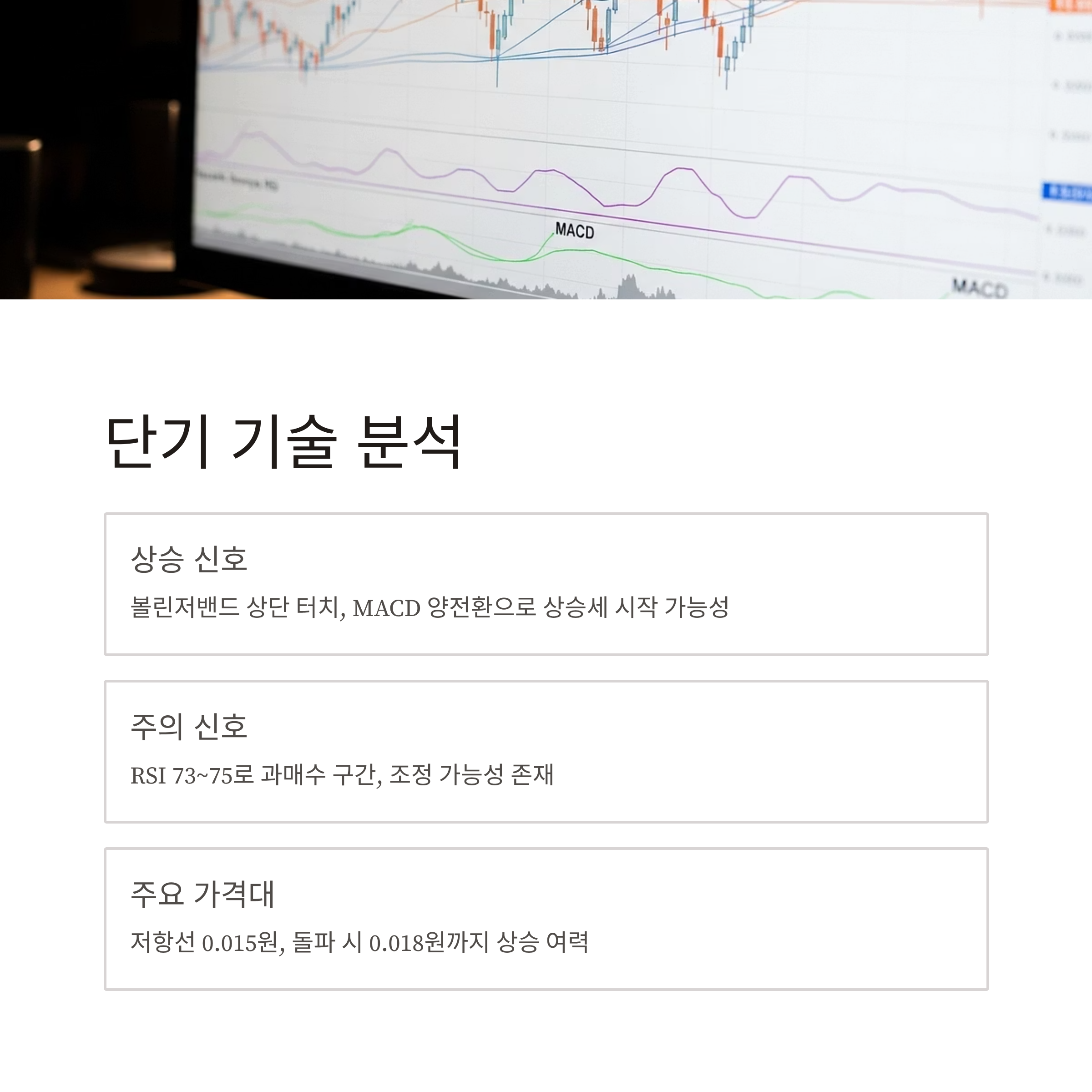 단기 저항선은 약 0.015원 수준이며, 이를 돌파할 경우 0.018원까지 추가 상승 여력이 존재합니다.