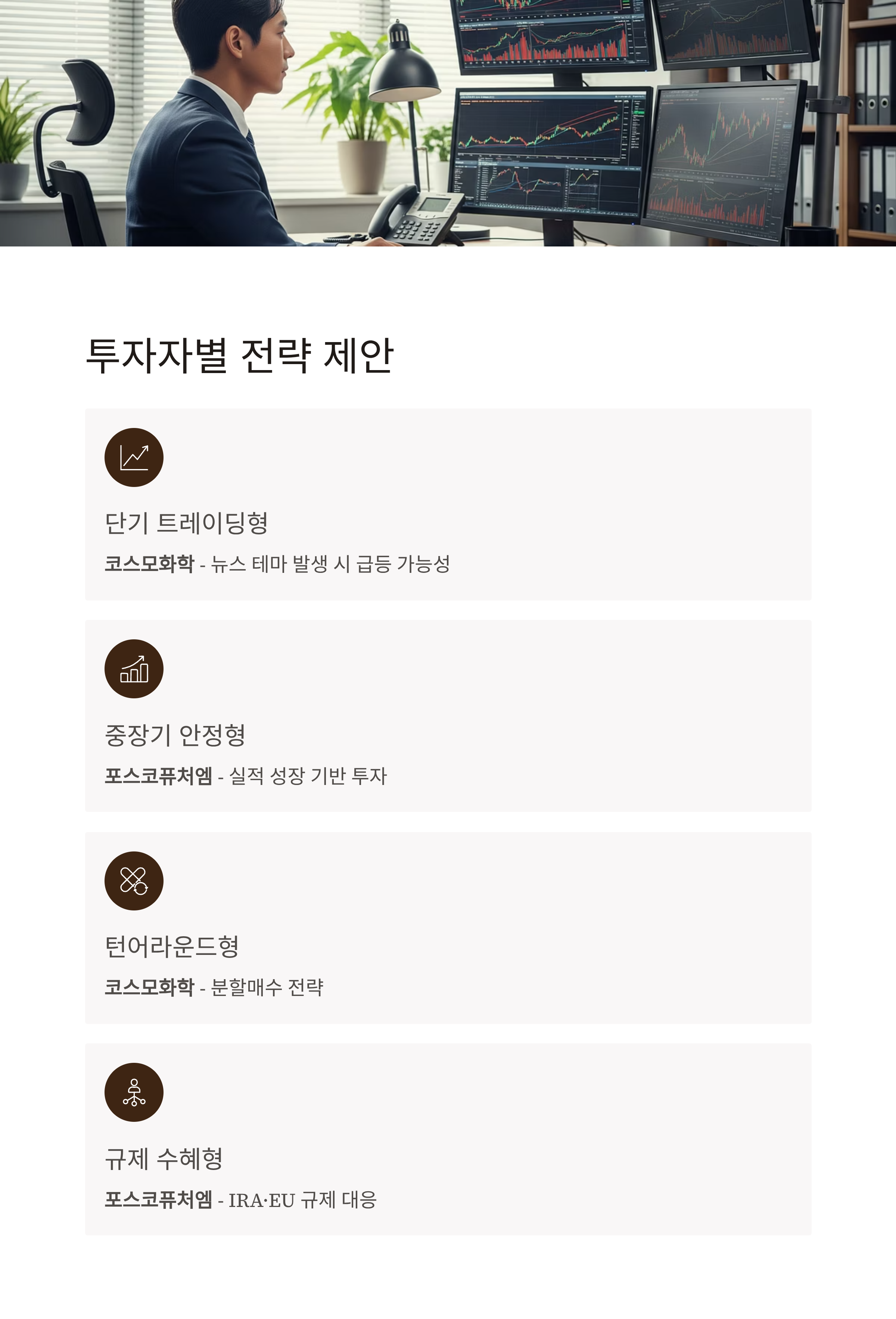 | 중장기 / 실적 기반 안정 추구형 | 포스코퓨처엠 | 실적 성장 + 글로벌 공급망 수혜 기대 |