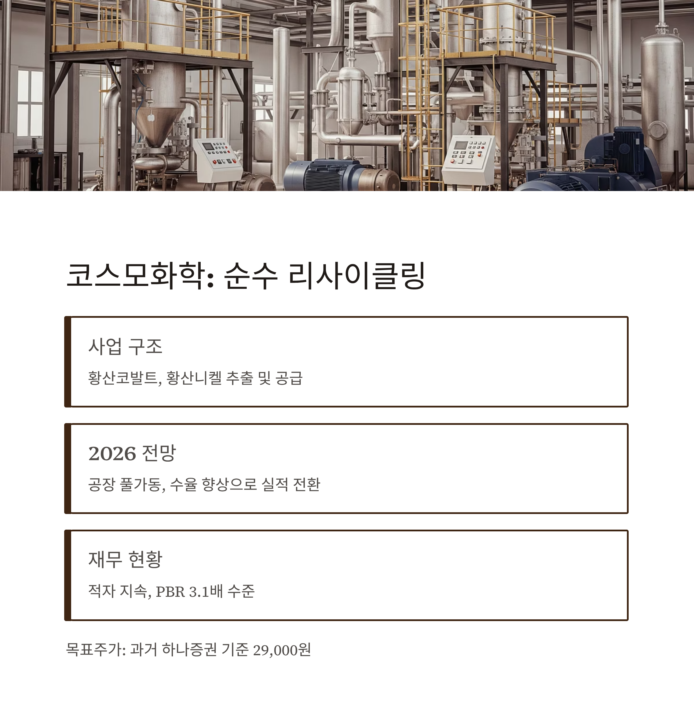 | 수익성 회복 베팅형 | 코스모화학 (분할매수) | 리사이클링 비중 상승, 향후 턴어라운드 가능성 |