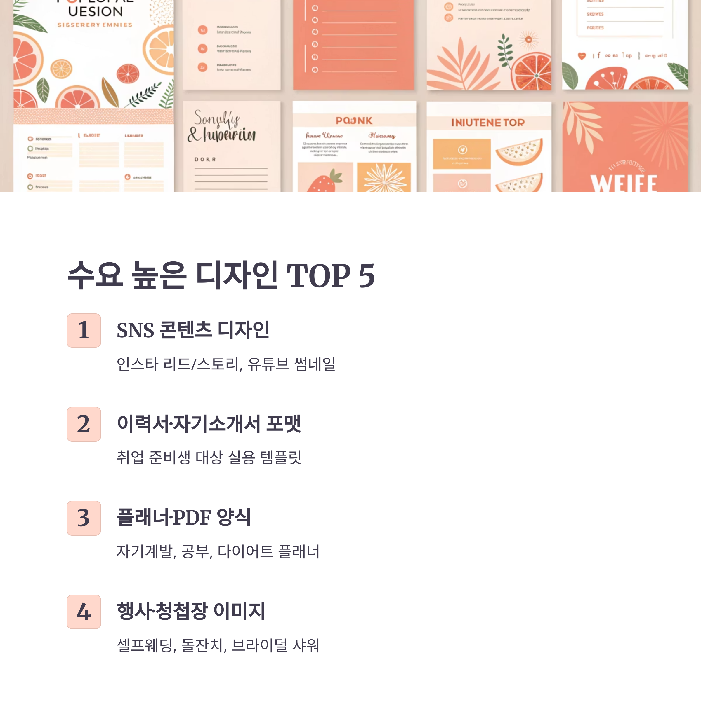 유형 특징 SNS 콘텐츠 디자인 인스타 리드/스토리, 유튜브 썸네일 등 이력서·자기소개서 포맷 대학생, 취업 준비생 대상 실용 템플릿 플래너·PDF 양식 자기계발, 공부, 일기, 다이어트 플래너 등 온라인 강의 썸네일 클래스101, 탈잉 강사 대상 디자인 행사·청첩장 이미지 셀프웨딩, 돌잔치, 브라이덜 샤워 등