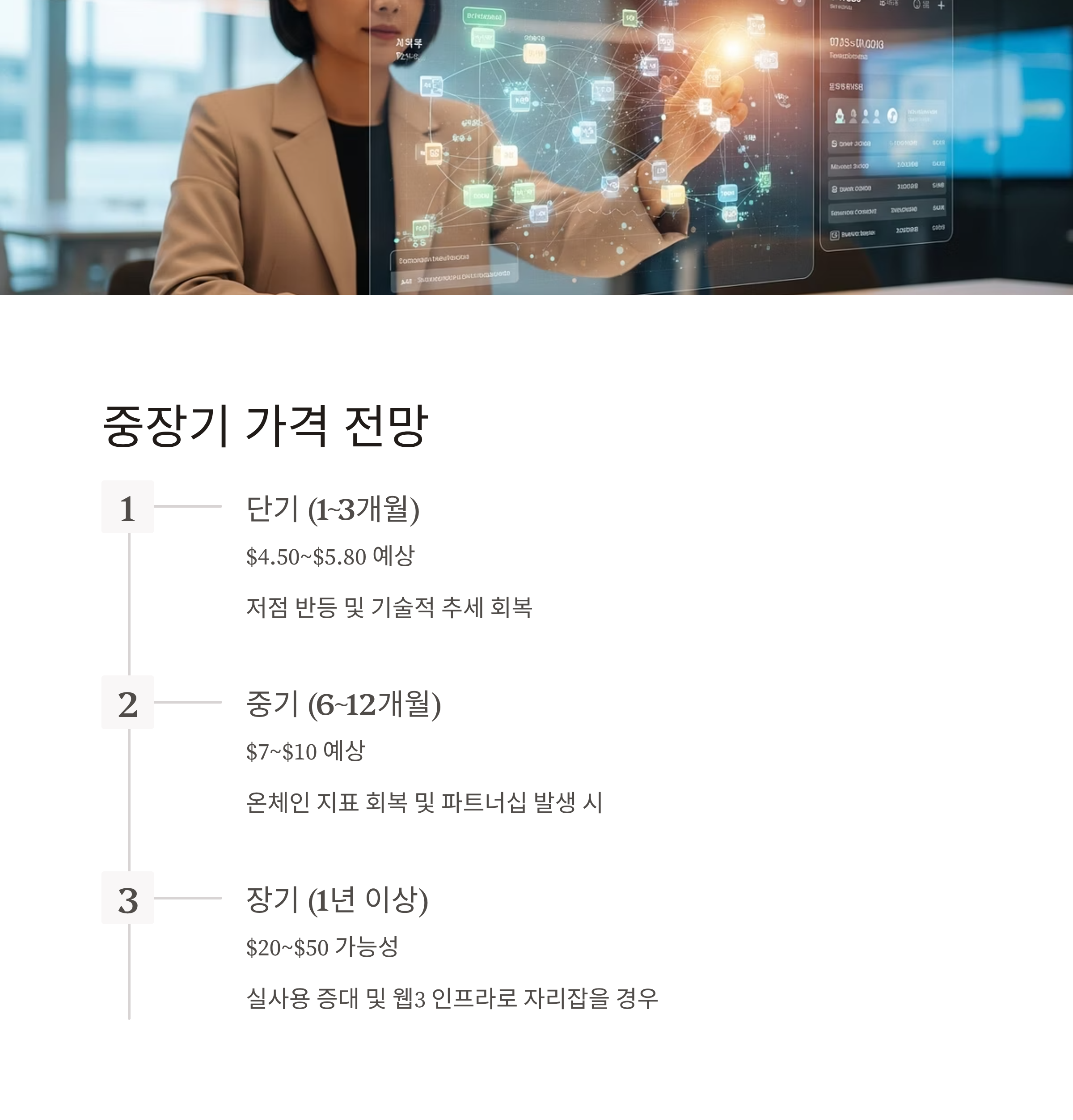 중기 (6~12개월) $7~$10 온체인 지표 회복 + 대형 파트너십 발생 시
