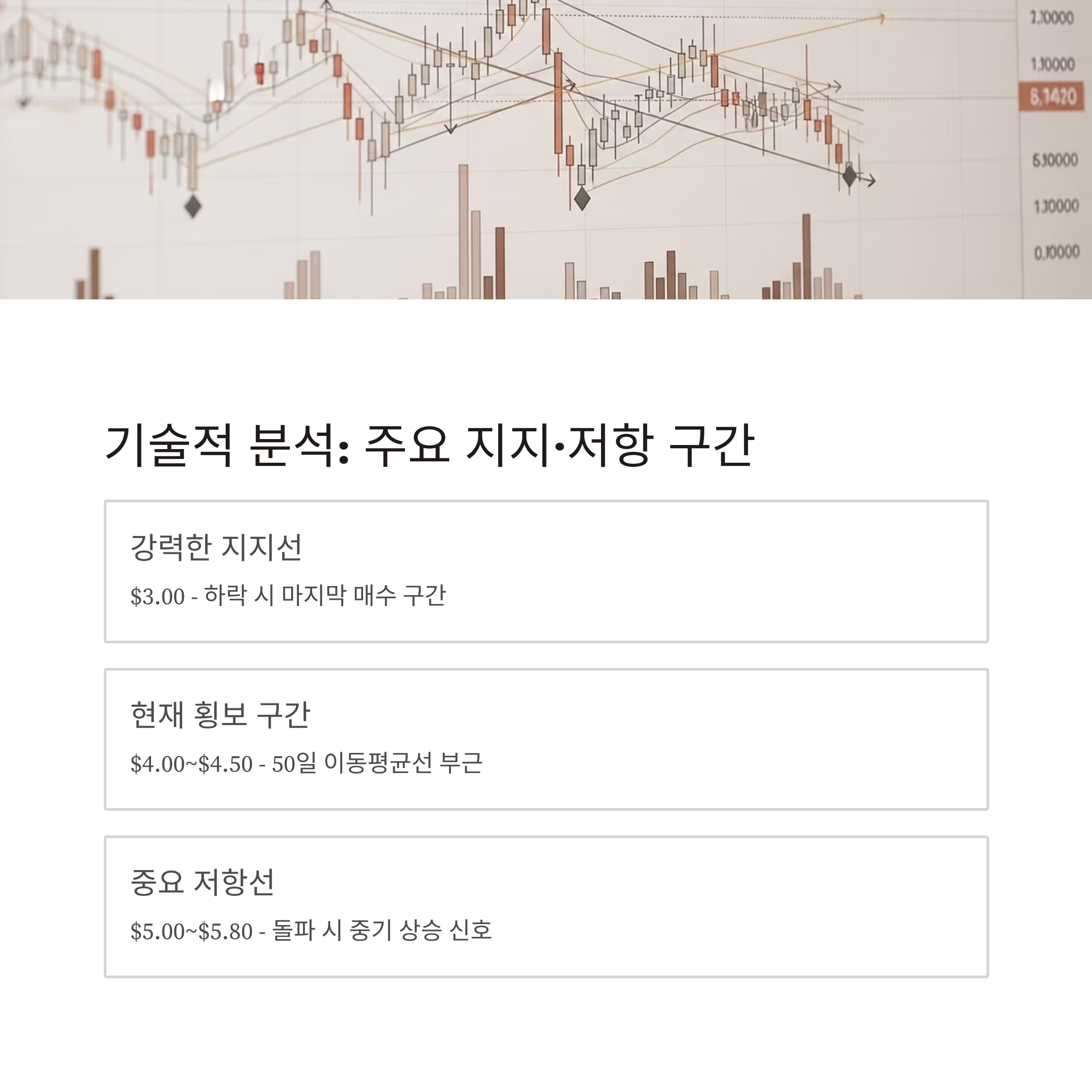 기술적 지표상 $3 부근이 강력한 지지선, $5~$5.8 구간은 중요한 저항선으로 작용하고 있습니다.