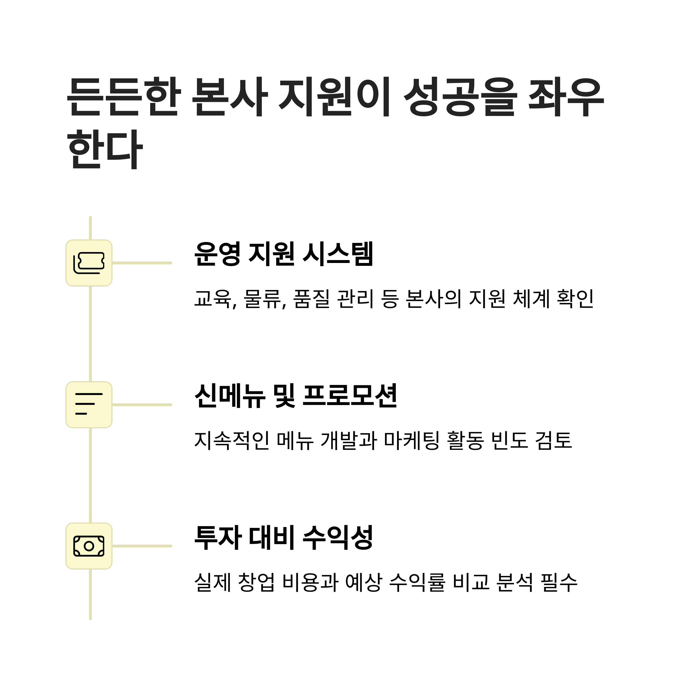 본사의 운영 지원 시스템과 사후 관리는 창업 초기 안정적인 운영에 필수적인 요소입니다.