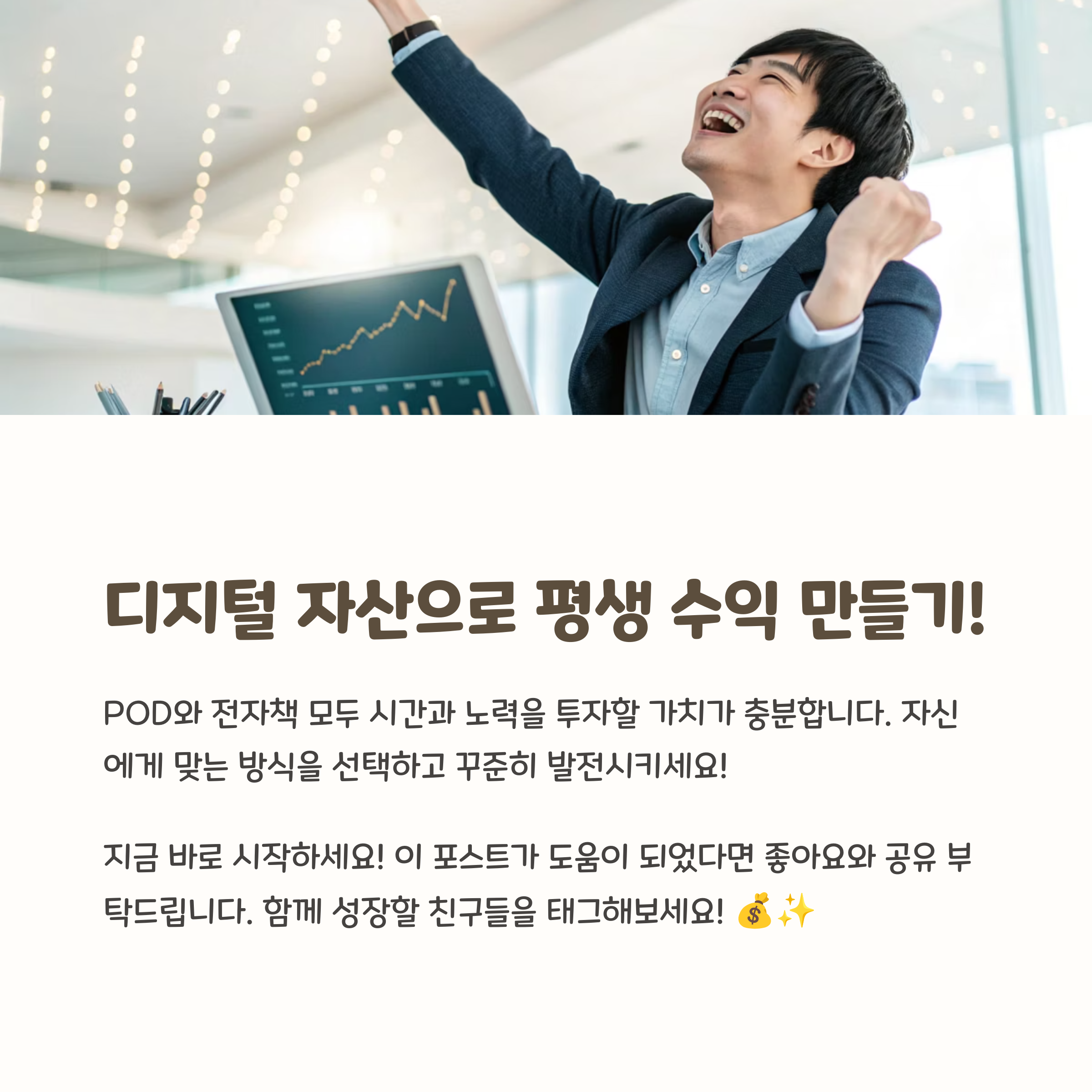 전자책은 마케팅 구조만 잘 갖춰지면 꾸준한 반복 수익에 유리하고, POD는 초기 수익은 낮지만 브랜드화할 경우 상품 확장성이 큽니다.