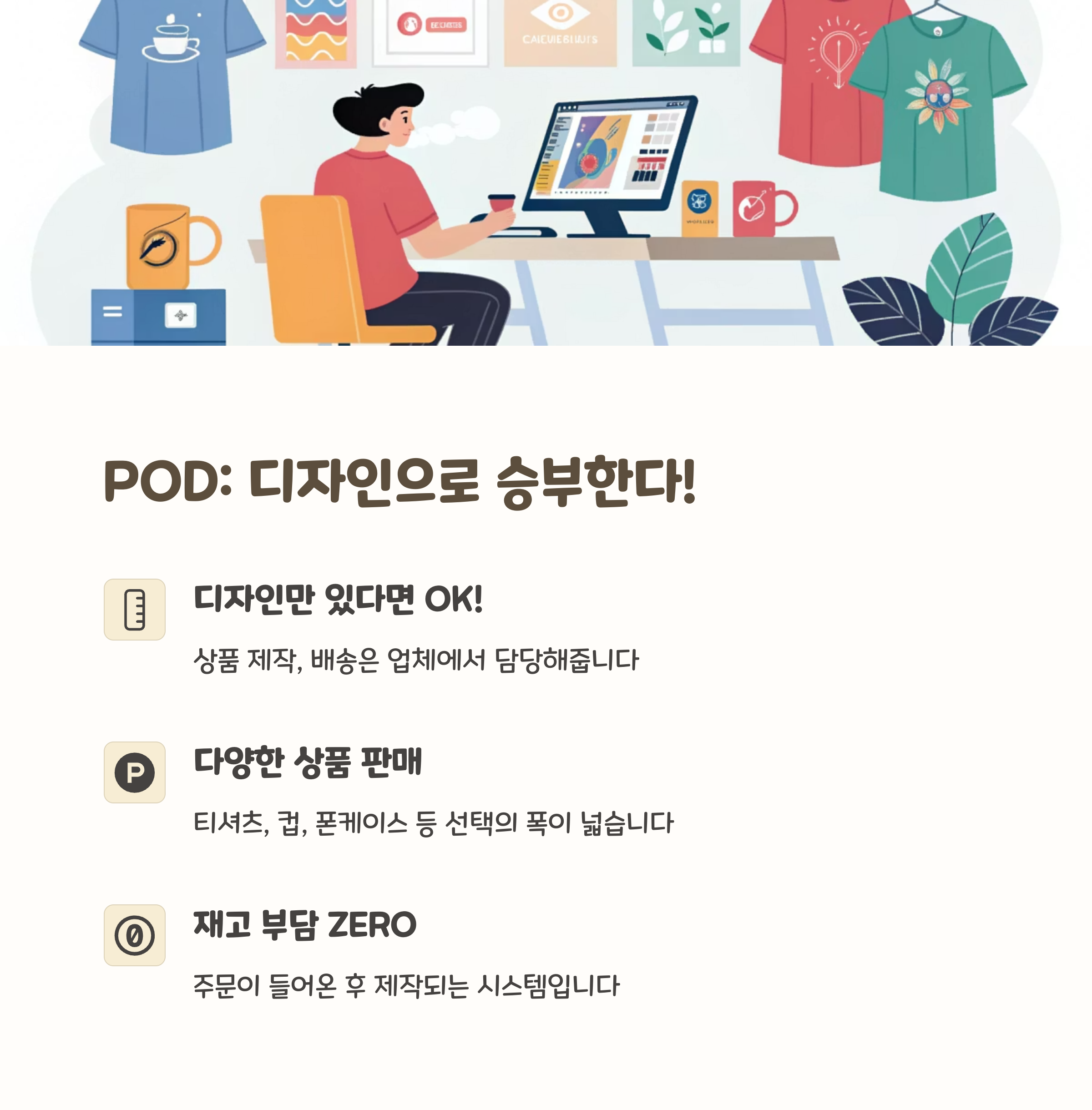 | 디자인 감각 기반 상품 판매 | 정보 콘텐츠를 글로 구성해 유통 | 한 번 제작 후 자동화로 지속 수익화 가능 |