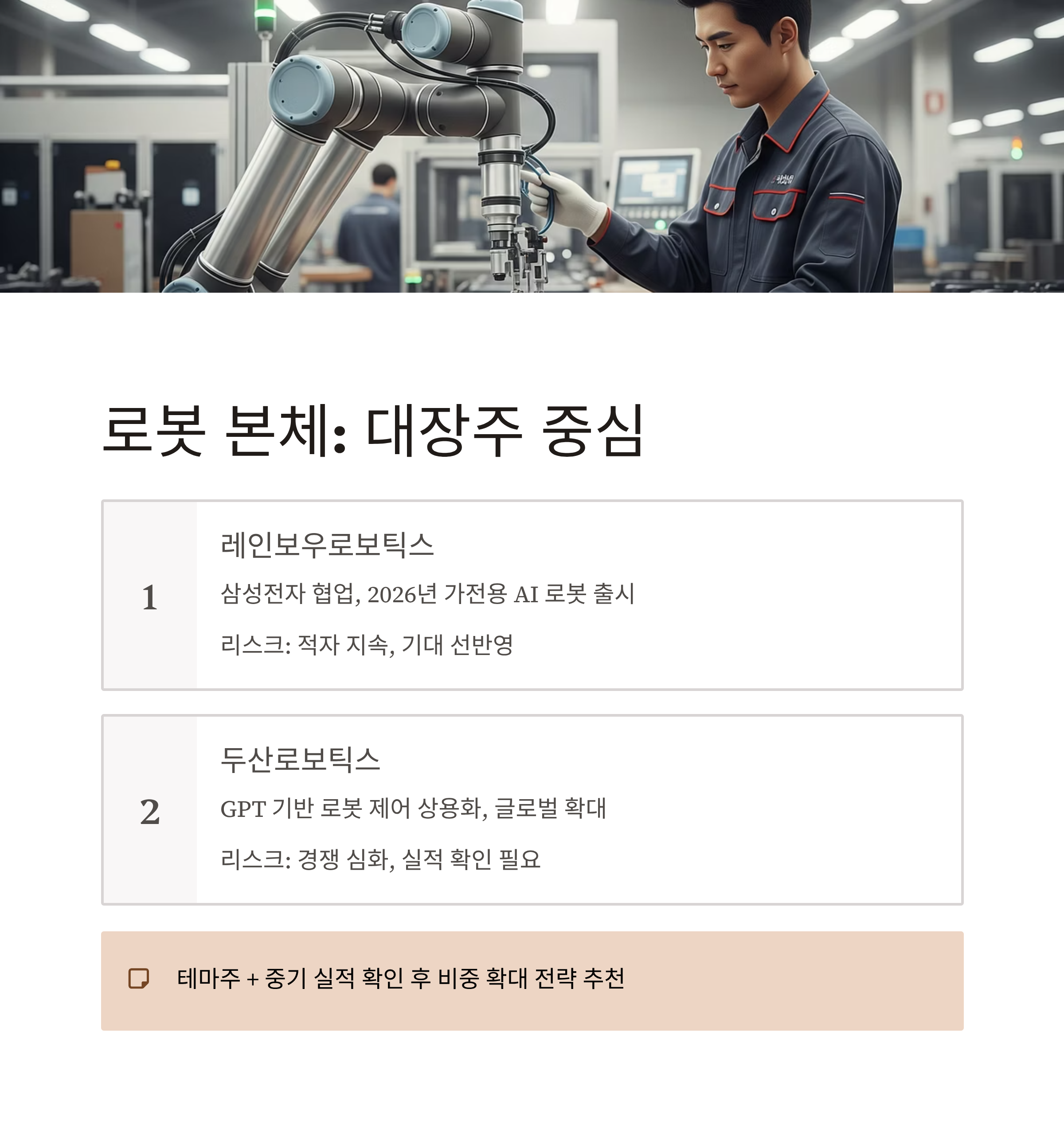 | 산업로봇 | 두산로보틱스 | GPT 제어 + 글로벌 시장 진출 확대 | 없음 |