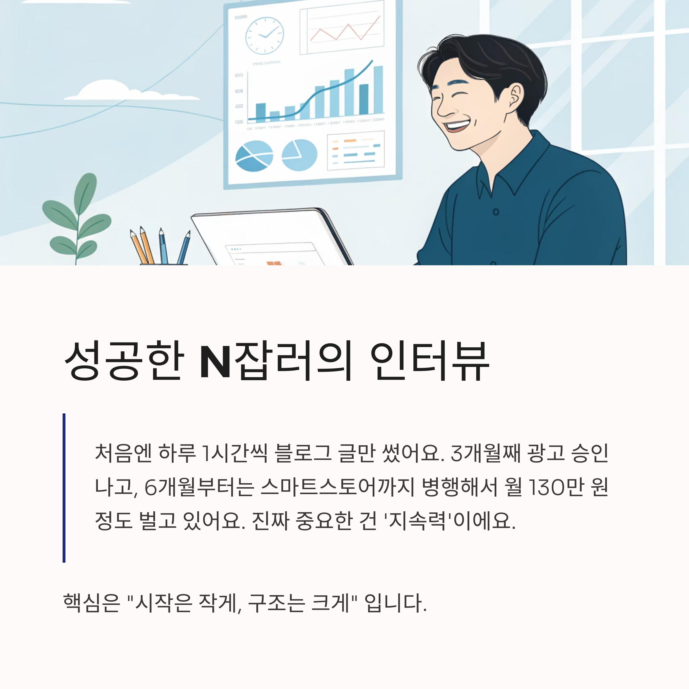 "처음엔 하루 1시간씩 블로그 글만 썼어요. 3개월째 광고 승인 나고, 6개월부터는 스마트스토어까지 병행해서 월 130만 원 정도 벌고 있어요. 진짜 중요한 건 '지속력'이에요."