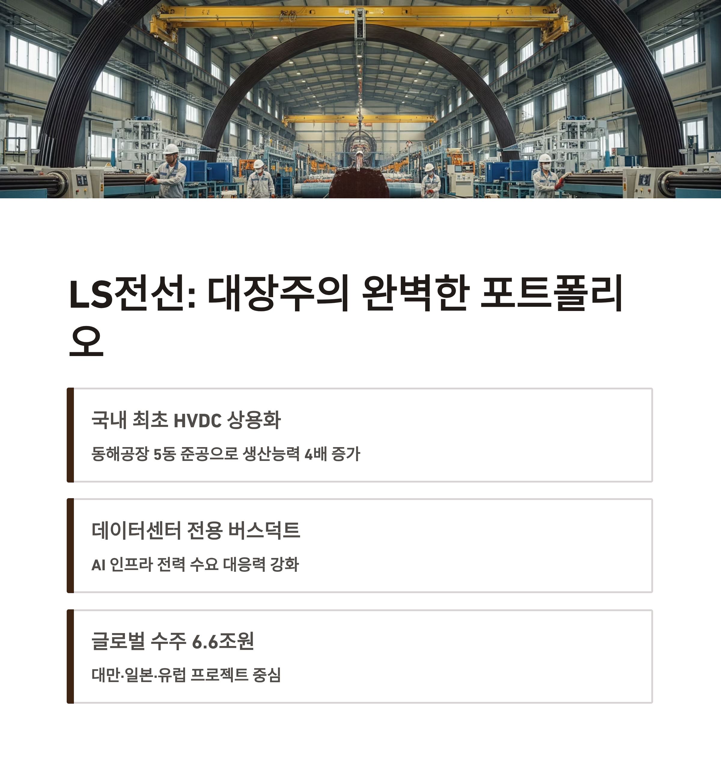 LS전선은 해저·육상 초고압 케이블과 통신용 광케이블까지 제조하는 국내 대표 전선업체입니다. 이미 HVDC 해저케이블을 국내 최초 상용화했으며, 최근 동해공장의 5동 준공으로 해저케이블 생산 능력이 4배 증가했습니다.