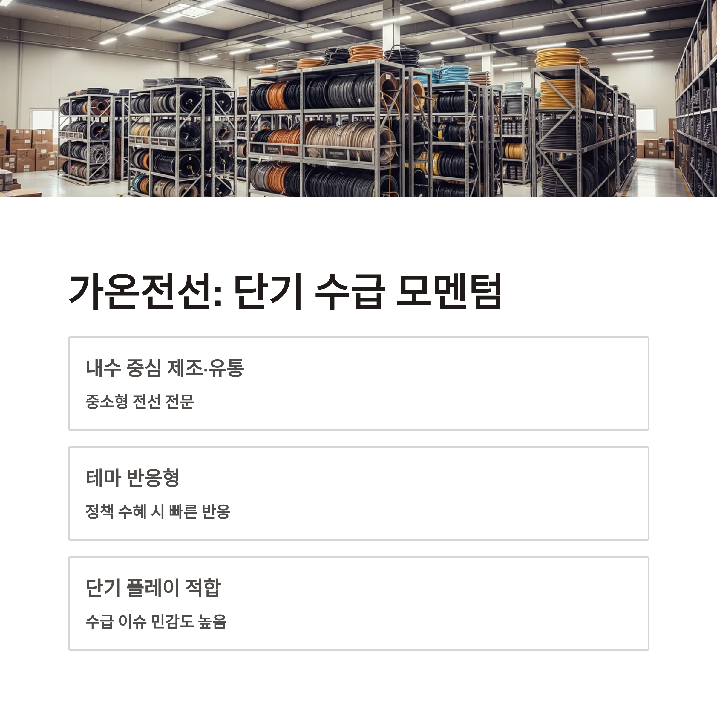 | 가온전선 | 중소형 전선 | 단기 수급 민감도 높음 | 실적 안정성 낮음 | 단기 테마형 |