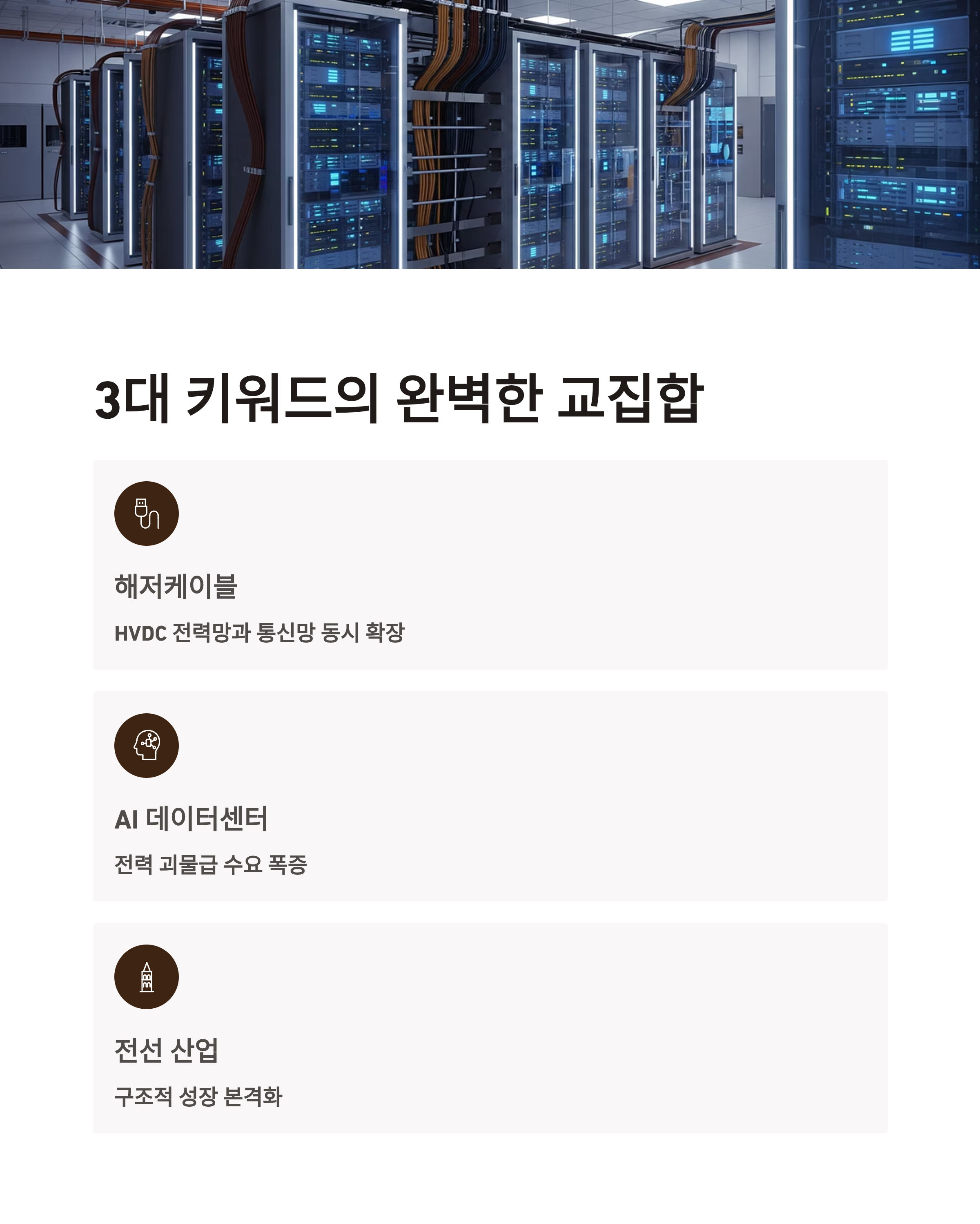 - 전력 분산 → 고압 케이블 + 변압기 + 버스덕트 수요 증가
