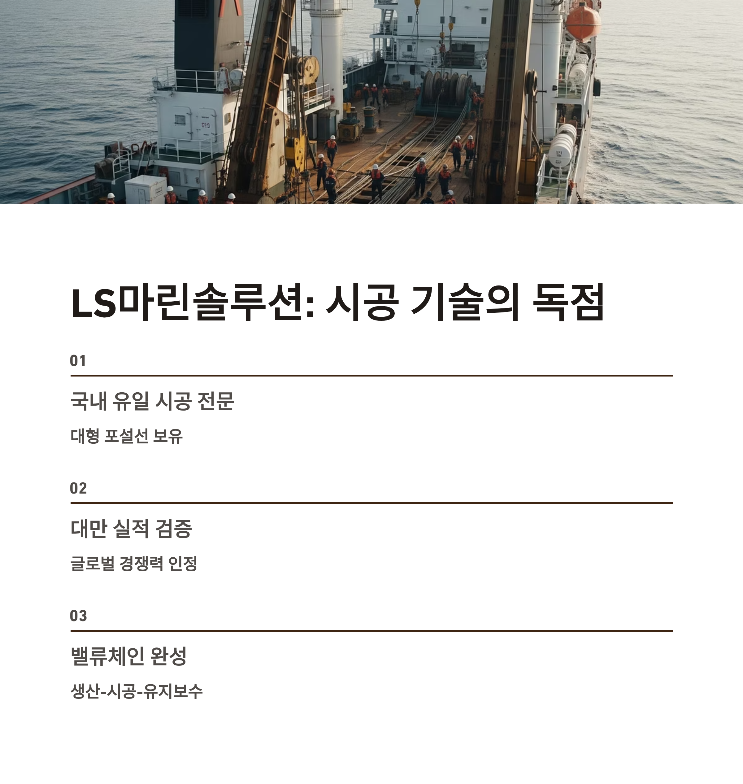 대형 포설선(선박)을 보유하고 있으며, LS전선과 연계해 ‘생산-시공-유지보수’ 밸류체인을 완성했습니다.