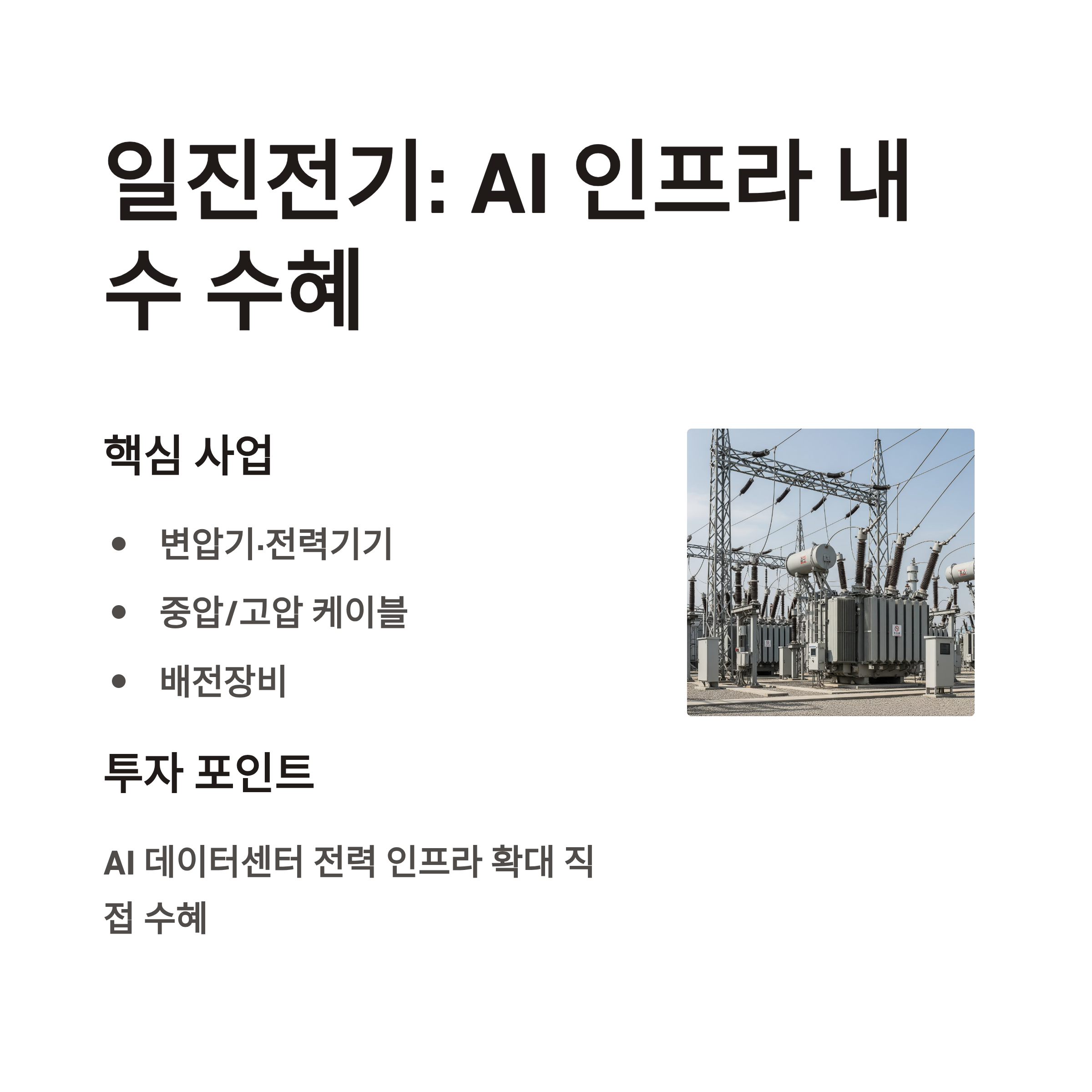 일진전기는 전력기기·전선·변압기 분야의 종합 인프라 기업으로, AI 데이터센터 확산에 따른 국내 전력 인프라 구축 수혜주로 주목받고 있습니다.
