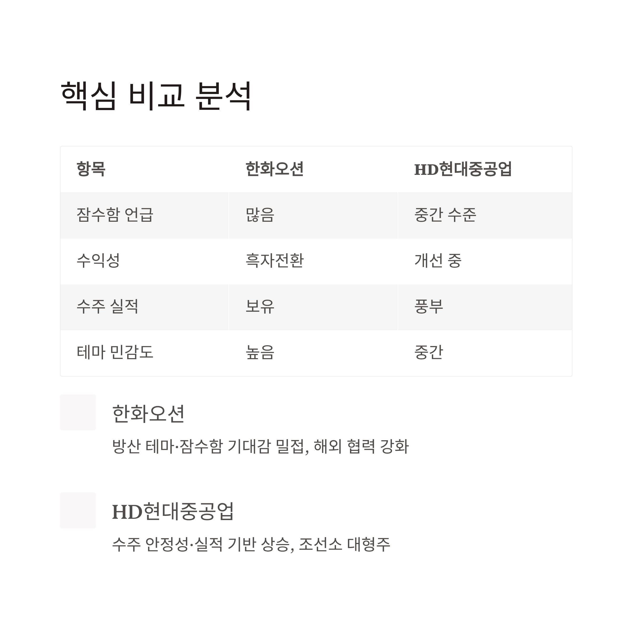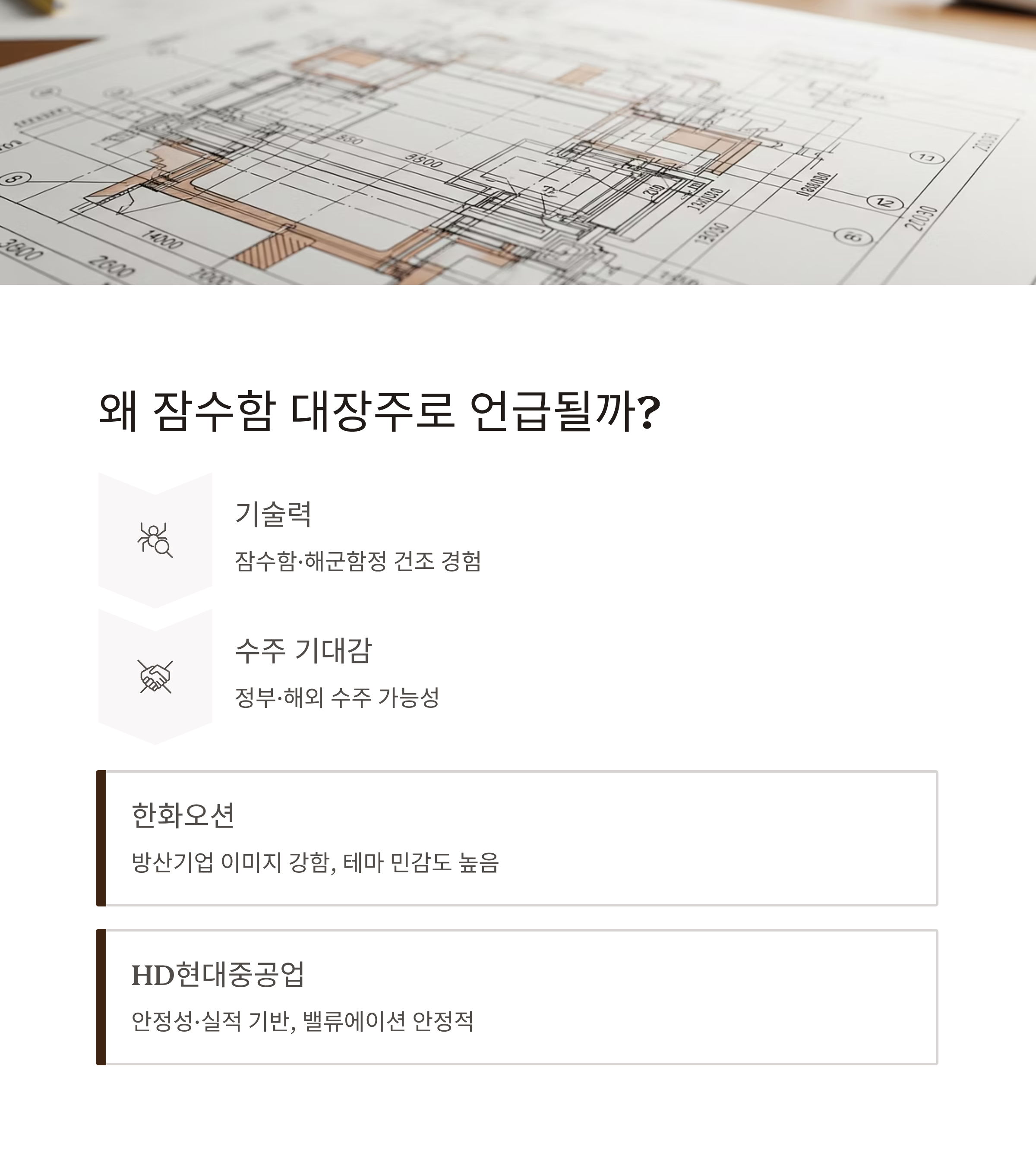 두 회사 모두 실제로 잠수함 혹은 해군함정 건조 경험이 있으며, 정부 또는 해외 수주 가능성도 언급되고 있죠. 특히 한화오션은 방산기업 이미지가 더 강하게 형성되어 있어 테마 민감도가 더 높습니다.
