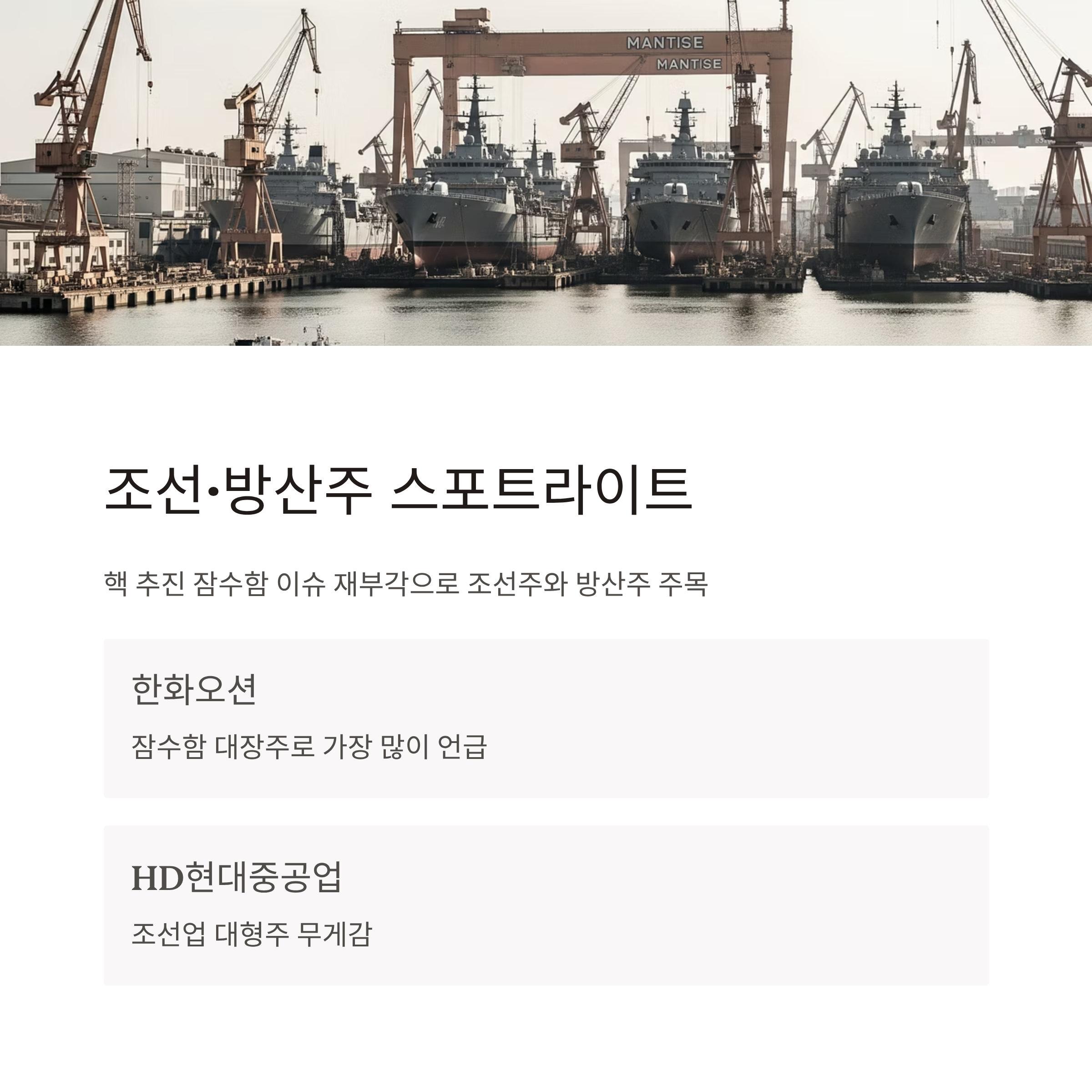 HD현대중공업은 대형 조선소로서 수주 안정성과 실적 기반 상승 가능성이 강점입니다. 다만 잠수함이라는 테마에선 직접적 언급은 한화오션보다 적습니다.