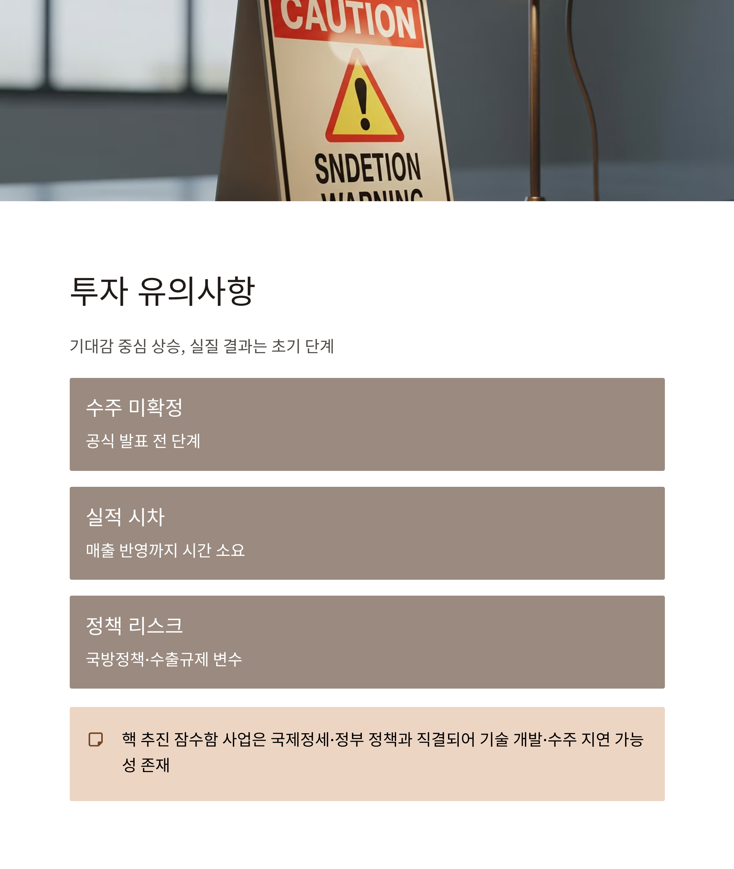 또한 핵 추진 잠수함 사업은 민감한 국제정세 및 정부 정책과 직결되기 때문에 정책 리스크, 기술 개발 지연, 수주 지연 등의 변수가 많습니다.