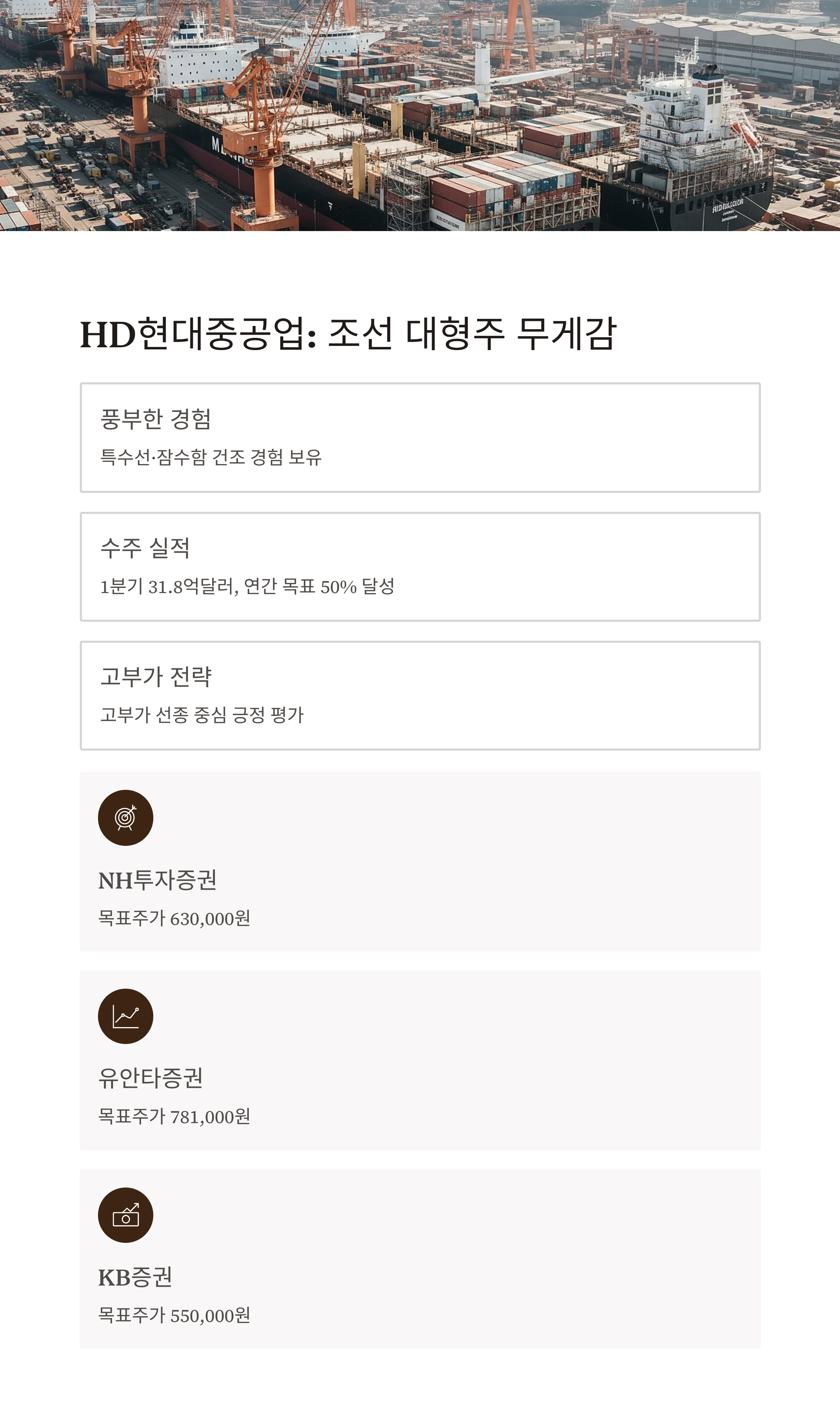 특히 대규모 선박 수주 모멘텀은 안정적인 기업가치 상승으로 연결되고 있어, ‘조선업 대장주’라는 타이틀을 유지하고 있습니다.