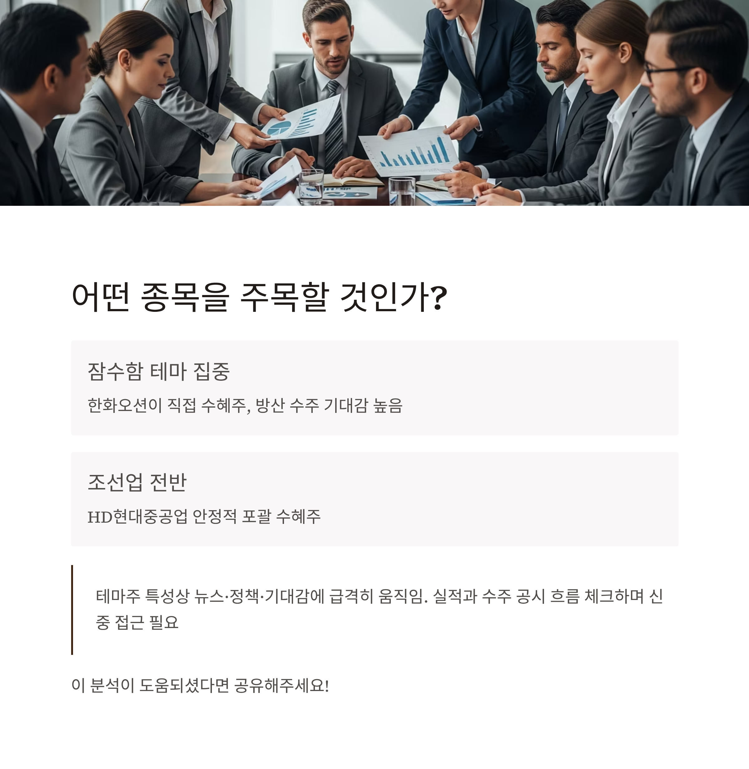 결론적으로 잠수함 테마 자체에 집중한다면 한화오션이 상대적으로 더 직접적인 수혜주로 거론됩니다. 방산 수주 기대감과 관련 뉴스를 중심으로 시장 관심도 역시 높죠.