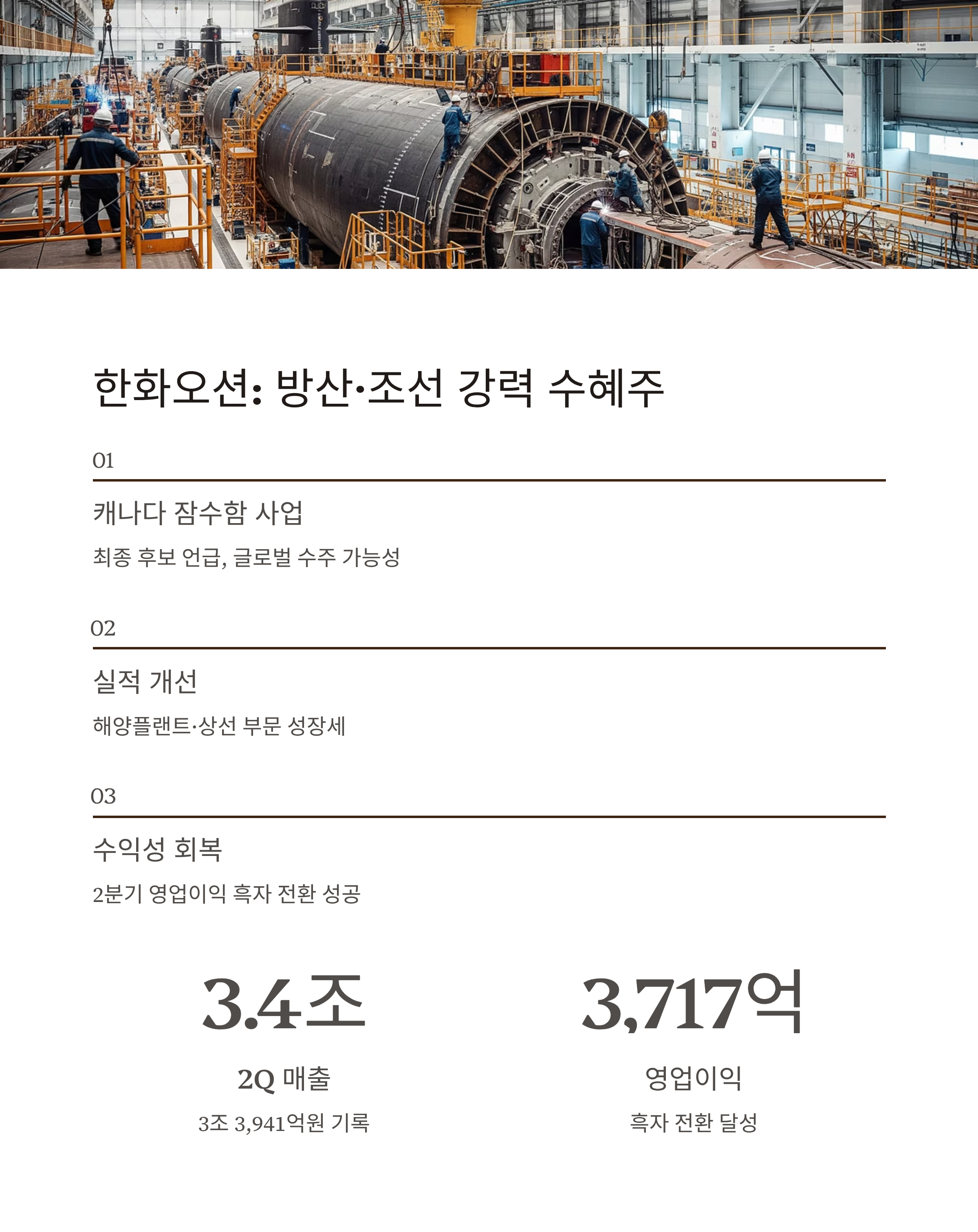 한화오션은 방산 테마와 잠수함 기대감에 더 밀접하게 연관돼 있으며, 최근 수익성 회복세와 해외 협력 강화가 매력 포인트입니다.
