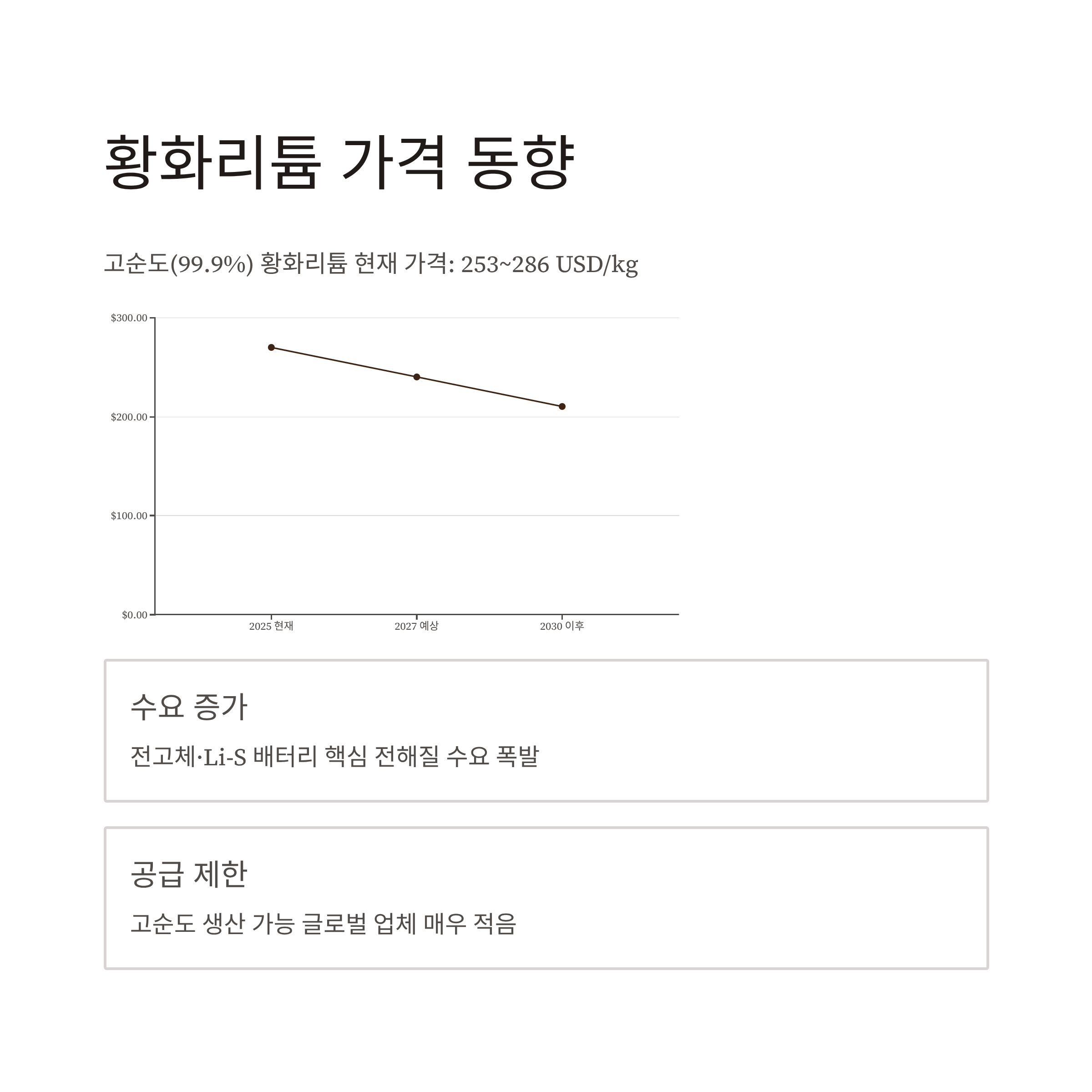 - 공급 제한: 고순도 황화리튬을 생산할 수 있는 글로벌 업체 수가 매우 적음